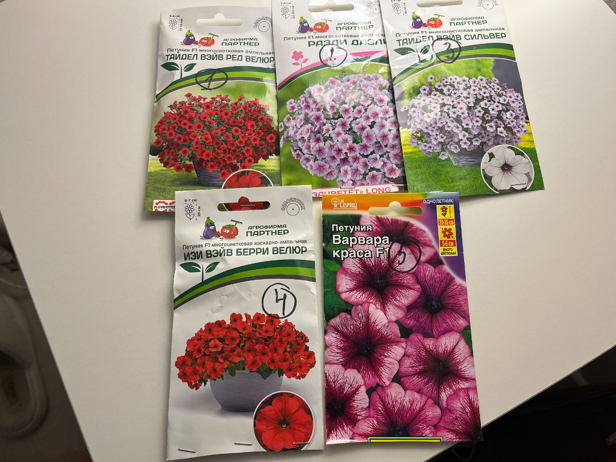 Петунии начинают сеять в середине - конце февраля. Мой способ посева очень прост, я не составляю специальный грунт, нет подсветки и семена самые обычные, хотя производители и заявляют, что это профессиональные семена, расфасованные (для нашего удобства) по несколько штук. Действительно, это удобно, когда можно купить по несколько штук каждого понравившегося сорта. Для моего сада много не нужно, в этом сезоне запланировано 15 кустиков (10 в грунт и 5 кашпо). Выбор сортов и гибридов. В этом году я повторяю опыт прошлого. Очень нравятся гибриды Easy Wave, Tidel Wave, поэкспериментирую лишь с расцветкой. Грунт. Самый обычный, универсальный, желательно, чтобы мелкий, без комков и мусора. Посев. 5 сортов сажаю в один контейнер. Семена - гранулы сею поверхностно на влажный грунт, затем поливаю пипеткой каждую гранулу (2-3 капли). Покрываю пластиковой крышкой или пищевой плёнкой. Ставлю на светлый подоконник, петуния прорастает на свету, у меня нет профессиональной лампы, иногда ставлю обычну