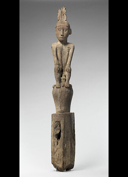 Коренные народы острова Борнео (Индонезия), известные под общим названием даяки, строили большие общие длинные дома вдоль берегов крупных рек и их притоков. Хампатонги, или защитные фигуры, охраняли входы в их деревни и дома. Этот внушительный хампатонг (его высота 180.3 см) представляет собой мужскую фигуру, сидящую на высоком кувшине. Согласно верованиям даяков, такие образы изгоняют злых духов и приносят удачу. Каждый хампатонг вырезается для определенной цели и олицетворяет определенного духа или божества. Сложный головной убор этой фигуры и деревянная копия дорогого кувшина мартабан позволяют предположить, что он, вероятно, изображает умершего человека высокого ранга. Дух умершего должен был вселиться в хампатонг, прежде чем начать свое долгое и опасное путешествие в загробный мир. Помимо антропоморфных фигур, для похорон важных персон вырезались также фигурки защитных существ, таких как тигры, медведи и леопарды. Спокойный натурализм данной фигурки заметно отличает её от других