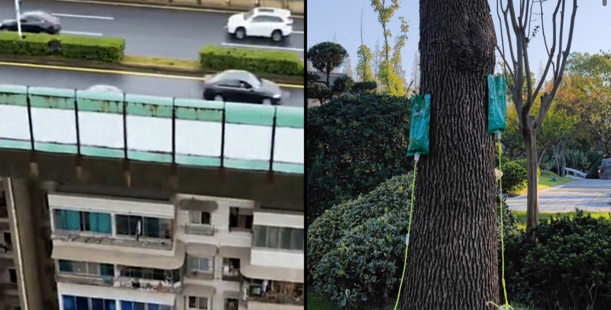 В этих емкостях содержится вещество для борьбы с вредителями. Несмотря на высокий ценник, китайцы предпочитают средство, чем высаживать новое дерево. Второе все равно выйдет дороже.