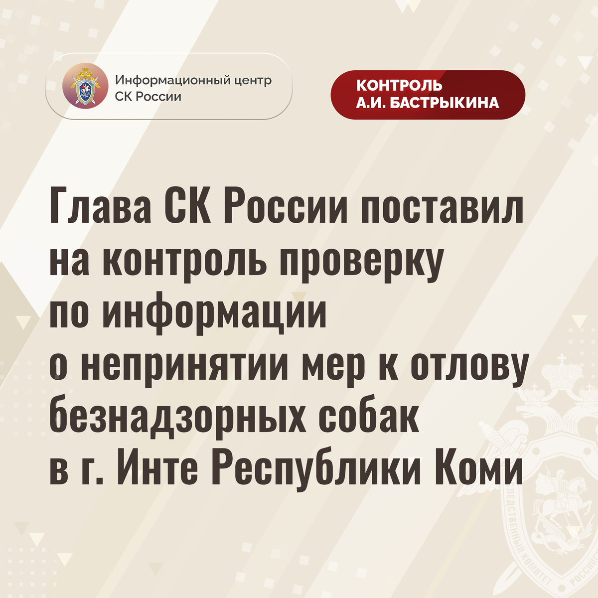 Глава СК России поставил на контроль проверку по информации о непринятии мер к отлову безнадзорных собак в г. Инте Республики Коми В комментариях в аккаунте приёмной Председателя СК России А.И. Бастрыкина «ВКонтакте» размещено обращение жителя города Инты Республики Коми по вопросу непринятия мер к организации отлова бродячих собак. Несмотря на то, что на территории населенного пункта на протяжении длительного времени обитает большое количество агрессивных животных, которые систематически нападают на местных жителей, меры к разрешению ситуации не принимаются. В СУ СК России по Республике Коми по данному факту начата процессуальная проверка. Председатель Следственного комитета Российской Федерации Александр Иванович Бастрыкин поставил ход процессуальной проверки на контроль в центральном аппарате ведомства и поручил руководителю СУ СК России по Республике Коми Андрею Николаевичу Исаеву представить доклад о ее промежуточных результатах и принятом по итогам решении. #СледственныйКомитет