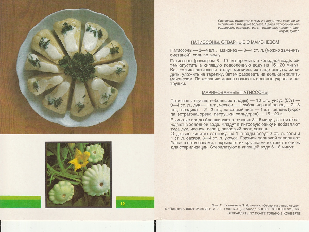 Патиссоны — удивительные овощи, которые часто остаются в тени своих более популярных родственников: кабачков и тыкв. Однако эти «тарелочные тыковки» (именно так переводится их название с французского *pâtisson*) заслуживают особого внимания. Они не только богаты витаминами, но и обладают нежным вкусом, который раскрывается в самых разных блюдах — от простых закусок до изысканных гарниров. В этом посте мы разберем два классических рецепта из советской кулинарной книги «Овощи на вашем столе» (1990 г.), а также погрузимся в историю, пользу и малоизвестные факты о патиссонах.