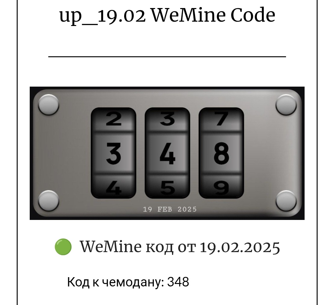 Код на сегодня вимайн НОВЫЙ ЕЖЕДНЕВНЫЙ КОД от КЕЙСА в WeMine на 19 февраля 2025 19.02.2025 WeMine Daily Combo Code #вимайн #код #насегодня #wemine Сегодня, 19.02.2025, КОД от КЕЙСА в WeMine: 348 Вводим код от кейса, чтобы получить вознаграждение. Код обновляется ежедневно в 20:00МСК До 20 февраля Ожидаем запуск нового пула в майнере USDT . Запуск https://t.me/WeMineBot/mine?startapp=ref_3NYLPNVN8E