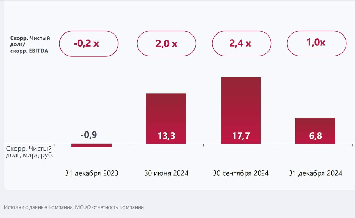 📌 Разработчик программного обеспечения Софтлайн ранее озвучивал цель по росту своей капитализации в 5 раз всего за 5 лет, однако в ноябре менеджмент сообщил о давлении высокой ключевой ставки на долговую нагрузку компании, в связи с чем прогноз менеджмента был понижен. Сегодня выясним, справилась ли компания с высокими процентными ставками, заглянув в финансовый отчет за 2024 год. • Оборот компании за 2024 год увеличился на 32% год к году до 120,7 млрд рублей, из них 29% пришлось на продажи продуктов собственного производства. • Четвёртый квартал для компании выдался довольно успешным: чистая прибыль составила 778 млн рублей против убытка в предыдущем году, несмотря на рост расходов на оплату труда сотрудников. • Софтлайну удалось снизить долговую нагрузку в 2 раза, показатель чистый долг/EBITDA теперь на комфортном уровне 0,97x. Согласно отчету за 9 месяцев, показатель составил 2,4x – тогда это вызвало беспокойство у многих инвесторов. • Скорректированная EBITDA выросла на 57% и сост