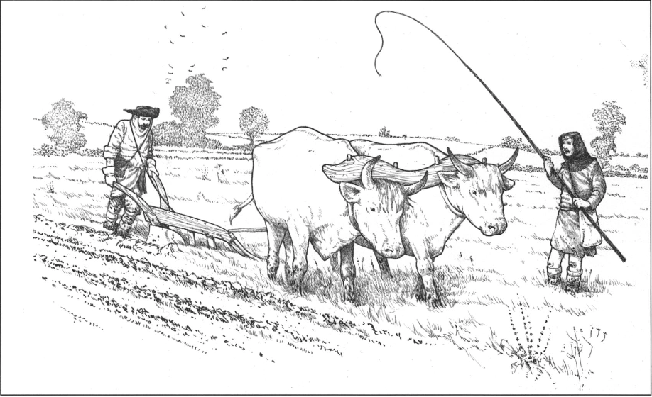 Плуг тянет пара волов, но в ирландском хозяйстве по статусу должно было быть минимум четыре вола. Это значит, что во время обработки почвы применялась борона, которой разбивали комья земли и закрывали борозды после сева. Судя по тому, что бороны не находят, это орудие было полностью деревянным и не имело сакрального смысла - его не жертвовали, а пускали на растопку. Каждое орудие обслуживает два человека: один контролирует плуг либо борону, второй управляет быками. Для колёсных конных плугов при вспашке на скорость иногда бывает необходим третий участник процесса — рулевой при этих колёсах, если в такой плуг запрягают волов, то их потребуется четыре-шесть, но скорость гона (прохода борозды) ниже, поэтому пахарь справляется без помощника. Лошади заменили волов сравнительно поздно, уже на границе Нового времени. В это время селекция позволила получить достаточно крупные так называемые холоднокровные породы - тяжеловозов.