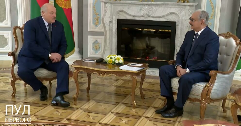 Президент Белоруссии Александр Лукашенко встретился с фельдмаршалом и верховным главнокомандующим Ливийской национальной армией Халифой Белкасимом Хафтаром в Минске в среду. На кадрах лидер страны приветствует главу армии Ливии объятиями, после чего обменивается рукопожатиями с членами прибывшей делегации. «Прошу считать, что вы приехали к своим друзьям, к себе домой. <…> У меня к вашему народу особое отношение. Я бывал в Ливии в свое время. Конечно, сегодня это уже другая Ливия, но вы должны знать, что мы готовы сделать для вас все, что вы увидите полезного в Беларуси. Все, о чем мы договоримся сегодня, в эти дни, которые вы будете в Беларуси, мы исполним вовремя», — отметил Лукашенко. В свою очередь, верховный главнокомандующий выразил готовность Ливии к стратегическому партнерству. Халифа Белкасим Хафтар прибыл в Минск в понедельник. В аэропорту его встретил председатель Комитета госбезопасности генерал-лейтенант Иван Тертель. По сообщениям местных СМИ, целью визита верховного главн