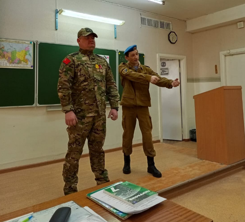 2025 год объявлен президентом России Владимиром Путиным – годом Защитников Отечества. Накануне праздника защитников – 23 февраля, ветераны саяногорского отделения Общероссийской общественной организации “РОССИЙСКИЙ СОЮЗ ВЕТЕРАНОВ АФГАНИСТАНА и СПЕЦИАЛЬНЫХ ВОЕННЫХ ОПЕРАЦИЙ” в Республике Хакасия побывали на необычном “Уроке Мужества” в 7 лицее. А необычный он был потому, что на нем присутствовали только девочки, ученицы 7 класса. Почётными гостями стали ветераны боевых действий Ринат Бегушев и Сергей Кочеров. С самого начала сложилась сложилась тёплая доверительная беседа. Школьницы внимательно слушали их рассказы о службе. За плечами Рината Бегушева – вторая Чеченская кампания, Сергей Кочеров в прошлом году вернулся с Украины. Кстати к Сергею было адресовано большая часть вопросов связанных со специальной военной операцией. У одних воют знакомые, у других – боец пропал без вести. Интересовала тема доставки гуманитарной помощи и быта солдат. Ещё девочки рассказали гостям о том, что посто