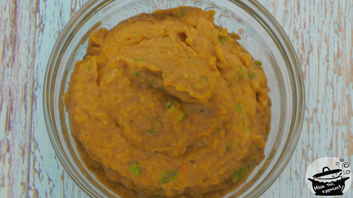 Ингредиенты: · лук - 1 шт.; · лук зелёный - 3 перышка; · помидоры - 2 шт.; · фасоль конс.- 2 банки; · паста чили - 1 ч.л.; · соевый соус - 1 ч.л.; · чеснок - 3 зубчика; · имбирь - 3*2 см. Приготовление: лук репчатый мелко порезать, очищенные от кожи помидоры порезать кубиком. В разогретой сковороде обжарить лук, добавить пасту чили, затем помидоры. Чеснок, имбирь измельчить, фасоль промыть, дать стечь. В сковороду добавить фасоль, имбирь, чеснок, соевый соус, готовить на среднем огне до выпаривания лишней влаги около 5 минут. Дать остыть, перебить блендером до однородной массы, вмешать измельчённый зелёный лук. Приятного аппетита!