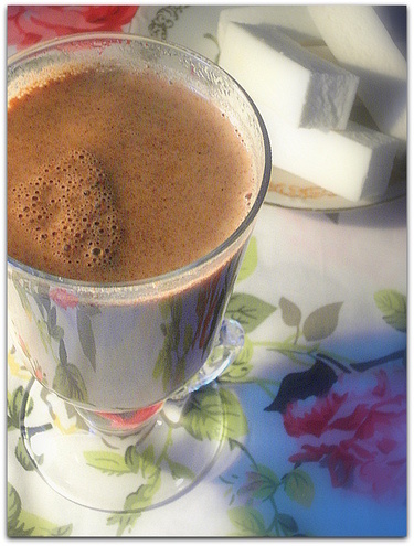Чаще я предпочитаю чёрный кофе с молоком или сливками (чтобы уж совсем лакшери), но иногда варю себе чашку вот такого согревающего напитка. - 1ч.л. свежемолотого кофе (или по вкусу) - 200мл. молока - 2ч.л. сахара (или по вкусу) - 1/4ч.л. корицы (по желанию) - 1/2ч.л. какао-порошка (по желанию) В турку насыпать кофе, сахар, корицу и какао-порошок, перемешать, чтобы избежать комочков и залить холодным молоком. Поставить на огонь и варить до закипания (подъёма кофейной пенки). Снять с огня, дать минуту постоять и процедить в стакан/бокал/кружку через кофейное (самое мелкое) сито. Мне такой напиток больше всего нравится сочетать с пастилой или зефиром. С шоколадкой тоже хорошо.