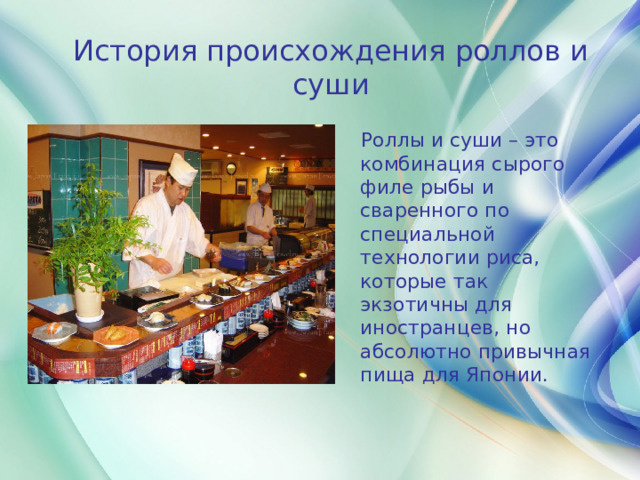 Роллы появились в XVIII веке в Японии. По преданию, их создавали представители феодального класса самураев как компактную еду для использования без столовых приборов. Для этого они закатывали рис в лист водорослей (нори) с начинкой внутри. Современные роллы были изобретены в США в 1960-х годах. Японские мигранты, жившие в Калифорнии, начали добавлять в роллы авокадо и краба, что сделало их более популярными среди американцев. Кроме того, была немного пересмотрена технология приготовления блюда: начинку и рис заворачивали в листы нори, а затем резали на порции. В 1970-х годах благодаря повару Ичиро Машита появилась новая разновидность суши — роллы. Работая в одном из ресторанов Лос-Анджелеса, Ичиро Машита захотел удивить посетителей. Он изменил технологию приготовления классических суши и создал рулетики из риса с добавлением морепродуктов и овощей в качестве начинки.