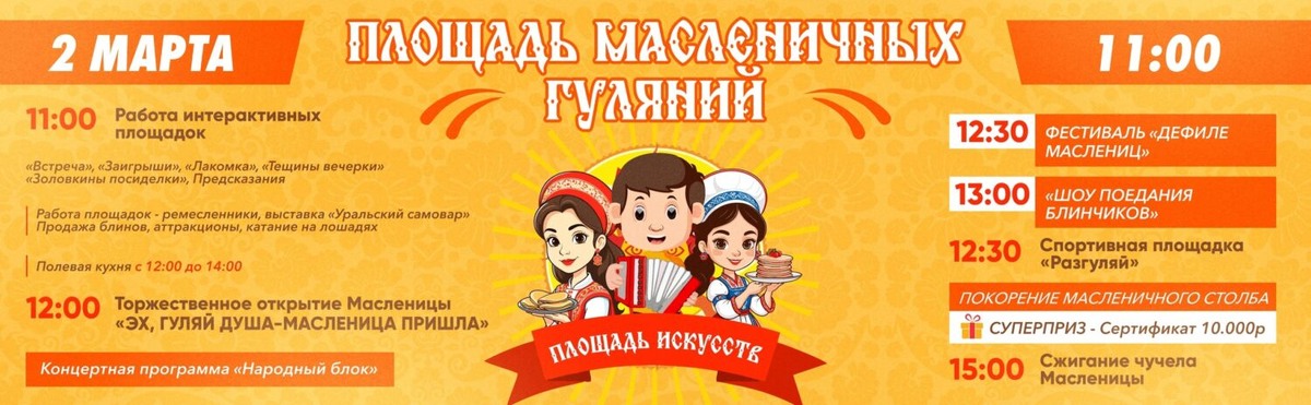 Традиционные масленичные гуляния в этом году пройдут 2 марта на Площади искусств перед Центром Культуры и Досуга. Красноуфимцев и гостей города ждет насыщенная программа, полная развлечений и угощений. В 11.00 начнут свою работу интерактивные подворья, посвященные разным дням Масленицы: «Встреча», «Заигрыши», «Лакомка», «Тещины вечерки», «Золовкины посиделки», а также площадка «Предсказания». Людей будут развлекать веселые скоморохи и ростовые куклы, с которыми можно сделать красочные фото. Аттракционы и катание на лошадях, несомненно, порадуют детей. На празднике будут продавать блины и другие лакомства, а также можно будет бесплатно отведать вкусной каши из полевой кухни и согреться горячим чаем. В это же время начинает свою работу ярмарка, где наши умельцы продемонстрируют свои изделия, а также выставка «Уральский самовар», которая порадует ценителей традиций. С полудня стартуют праздничные мероприятия. 12.00 — торжественное открытие «Эх, гуляй, душа — Масленица пришла!» и яркая кон