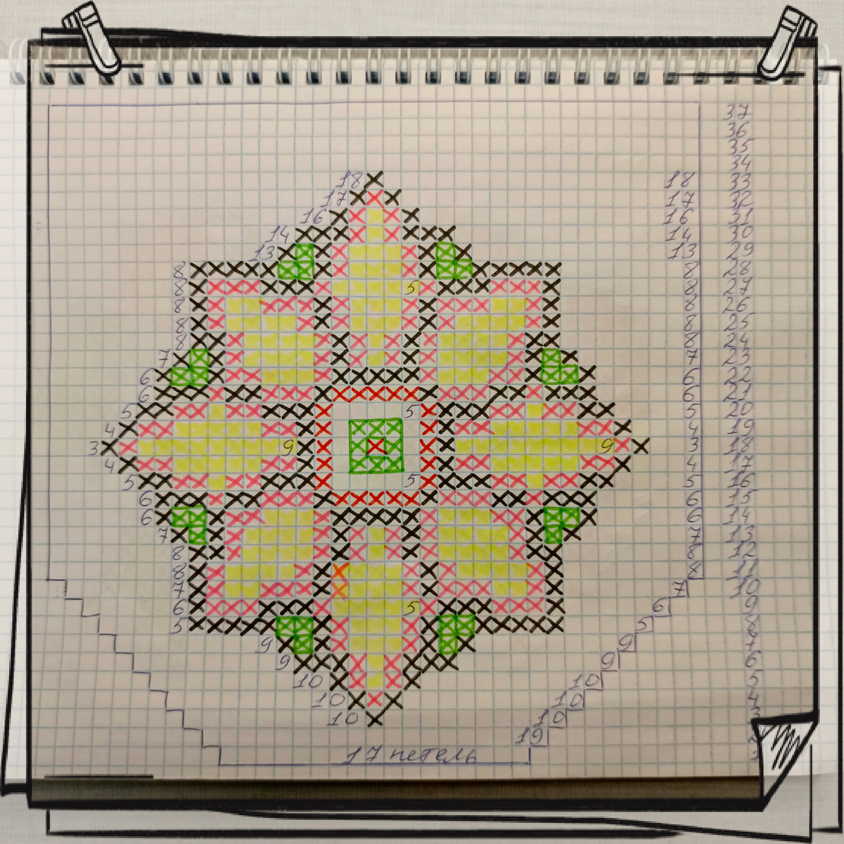 1ряд-Набираем 17 петель основной нитью. 2ряд-вяжем 19 петель осн. нитью с прибавками. 3ряд-10 осн.1 чёрн.10 осн. с приб. 4ряд-10 осн.1 чёрн.1 роз.1 чёрн.10 осн. с приб. 5ряд-10 осн.1 чёрн.1 роз.1 жёлт.1 роз.1 чёрн.10 осн. с приб. 6ряд-9 осн.3 чёрн.1 роз.1 жёлт.1 роз.3 чёрн. 9 осн с приб. 7ряд-9 осн.1 чёрн.1 зел.1 чёрн.1 роз.3 жёлт.1 роз1 чёрн.1 зел.1 чёрн.9 осн. с приб. 8ряд-5 осн.5 чёрн.2 зел.1 чёрн.1 роз.3 жёлт.1 роз.1 чёрн.2 зел.5 чёрн.5 осн. с приб. 9ряд-6 осн.1 чёрн.3 роз.3 чёрн.1 роз.5 жёлт.1 роз.3 чёрн.3 роз.1 чёрн.6 осн. с приб. 10ряд-7 осн.1 чёрн.1 роз.2 жёлт.3 роз.1 чёрн.1 роз.3 жёлт.1 роз.1 чёрн.3 роз.2 жёлт.1 роз.1 чёрн.7 осн. с приб. 11ряд-8 осн.1 чёрн.1 роз.4 жёлт.1 роз.1 чёрн.1 роз.3 жёлт.1 роз.1 чёрн.1 роз.4 жёлт.1 роз.1 чёрн.8 осн. с приб. 12ряд-8 осн.2 чёрн.1 роз.4 жёлт.1 роз.1 чёрн.1 роз.1 жёлт.1 роз.1 чёрн.1 роз.4 жёлт.1 роз.2 чёрн.8 осн. без. прибавок. 13ряд-7 осн.1 чёрн.1 зел.1 чёрн.1 роз.4 жёлт.1 роз.1 чёрн.1 роз.1 жёлт.1 роз.1 чёрн.1 роз.4 жёлт.1 роз.1 чёрн.1 з