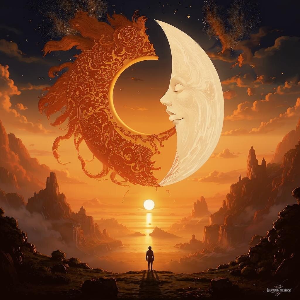 Однажды, гуляя по берегу реки, Луна увидела яркое сияние на горизонте. Это был парень по имени Солнце. Энергия его была поистине ослепительна. Лицо излучало тепло и свет, а улыбка была такой яркой, что могла осветить даже самые тёмные уголки души. Когда их взгляды встретились, между ними пробежала искра, подобная молнии, разрезавшей ночное небо.