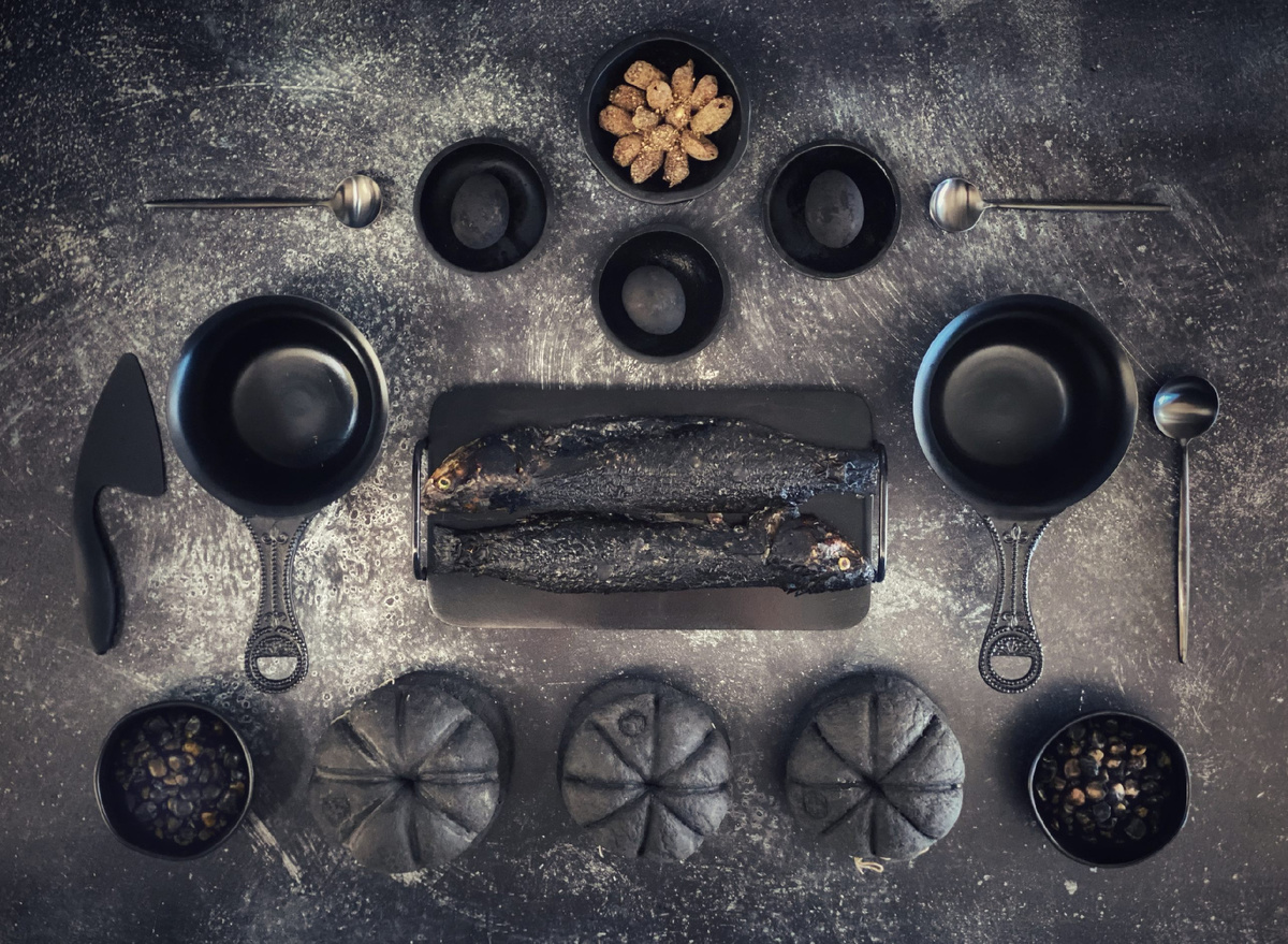 Гости ужина усаживались на кушетки за стол. Перед ними симметрично раскладывали жареную кефаль, крошечные булочки panis quadratus, куриные яйца угольного цвета, финики, посыпанные черным перцем, и нутом. Все блюда были темно-черного цвета и подавались исключительно в черной посуде.