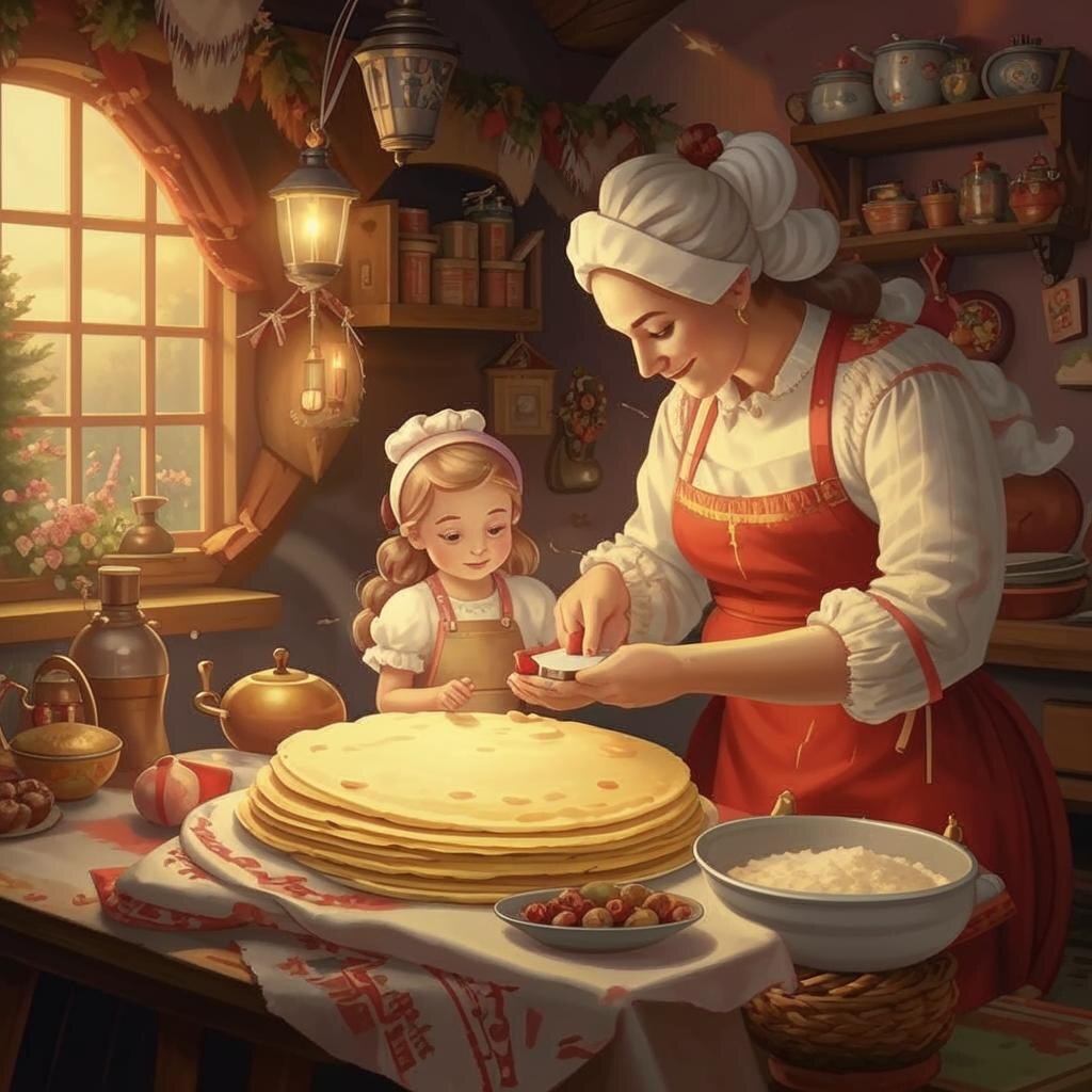На окраине деревни стоял уютный домик, утопающий в снегу. Из трубы вился дымок, разносивший аромат свежей выпечки. Это был дом Агафьи, известной на всю округу своей гостеприимностью и мастерством приготовления блинов. Говорили, что её блины — самые вкусные во всей деревне, тонкие, золотистые, с хрустящей корочкой.