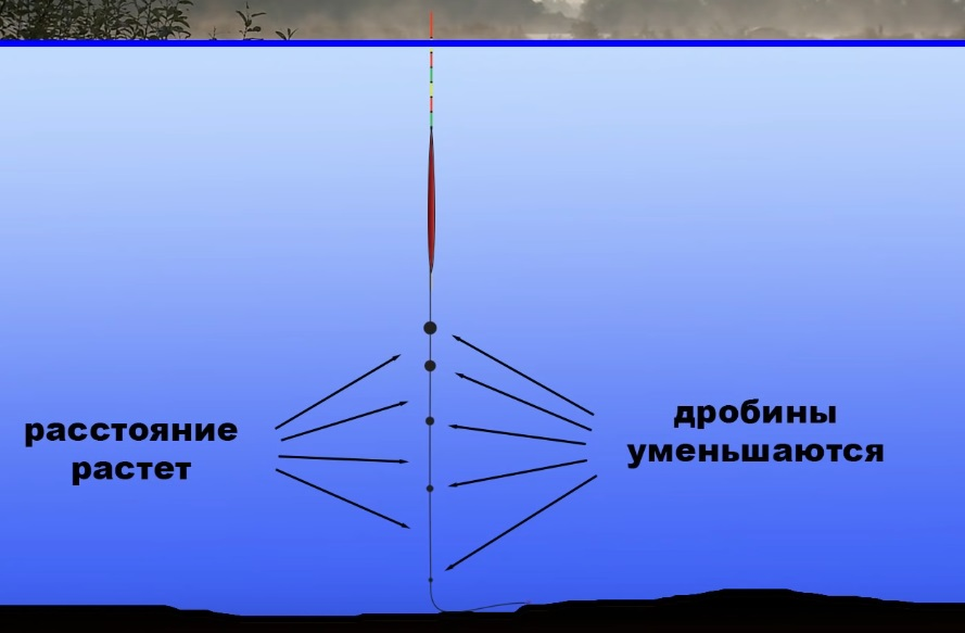 Основное грузило должно быть расположено ближе к поплавку, а дополнительные дробинки — ближе к поводку.