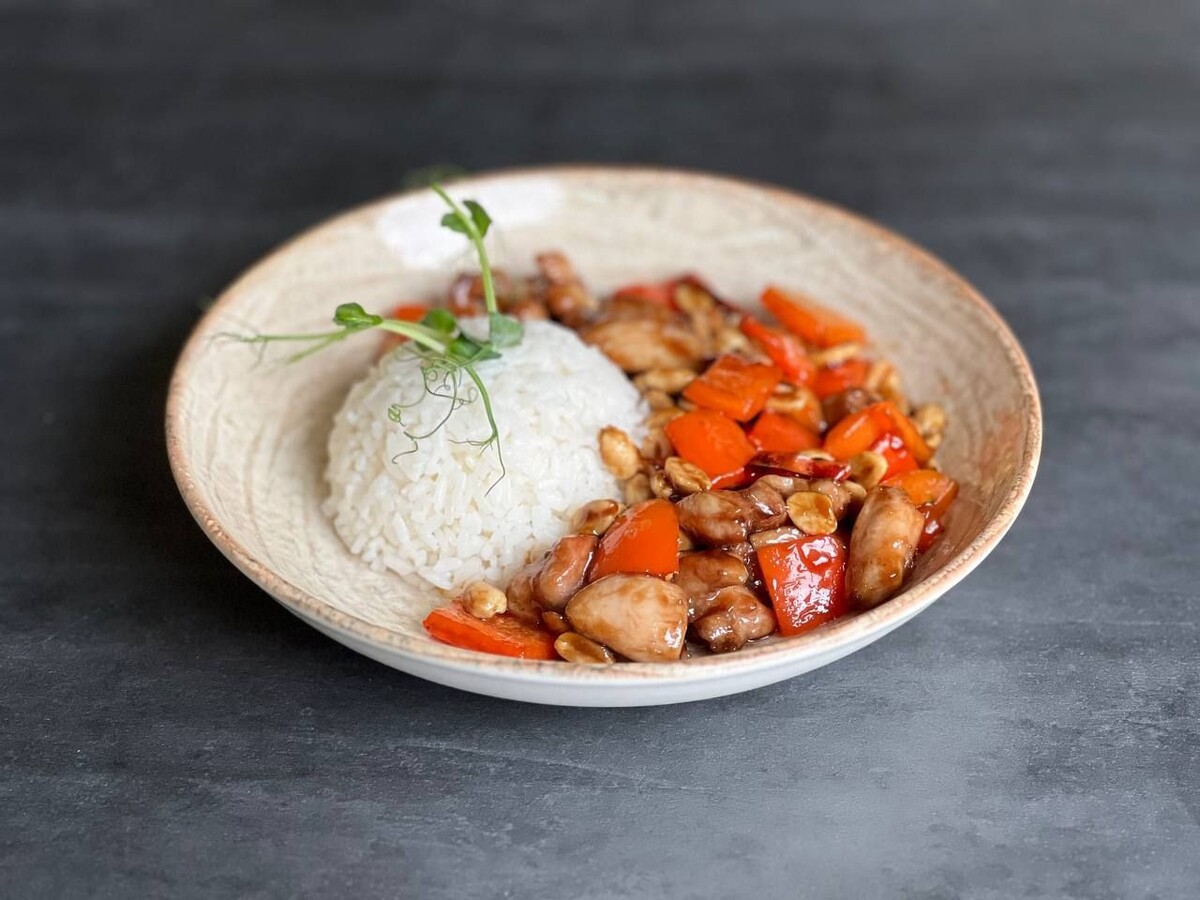 Придумал её чиновник живший в династии Цинь в 3 в. До н.э. Дин Баочжень. Занимал он при императорском дворе должность гунбао- воспитывал наследника престола. По совместительству угощал своих гостей жаренными кусочками курицы по собственному рецепту. После став наместником в провинции Сычуань приспособил своё блюдо под местные нравы. Добавив в него острый перец и пряностей. В дальнейшем блюдо получило название << Гунбао цзидин>> или цыплёнок << кунг пао>>. Вот такая история). Само блюдо я пробовал в заведении китайской кухни << Пекинский дворик>>. Сражу скажу что блюдо само по себе очень острое) но любителям поострее оно зайдёт на ура)!