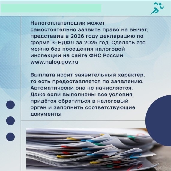 С 1 января этого года налогоплательщики могут воспользоваться новым стандартным вычетом за выполнение нормативов Всероссийского физкультурно-спортивного комплекса «Готов к труду и обороне». Размер вычета составляет 18 000 рублей в год. Эта сумма от заработной платы не будет подлежать налогообложению НДФЛ. Максимальная сумма к возврату – 2 340 рублей. Вычет предоставляется тем, кто впервые награжден знаком отличия ГТО, или повторно выполнил нормативы и подтвердил полученный ранее знак. Важное условие – прохождение диспансеризации в том календарном году, в котором произошло награждение соответствующим знаком отличия или его подтверждение. Налоговый вычет можно получить в 2025 году у работодателя в любом месяце налогового периода, единовременно, но не ранее месяца, когда работник подтвердил право на него. Если в течение года налоговый вычет не был получен у налогового агента или был получен не в полном размере, налогоплательщик вправе заявить своё право на вычет, представив в 2026 году в