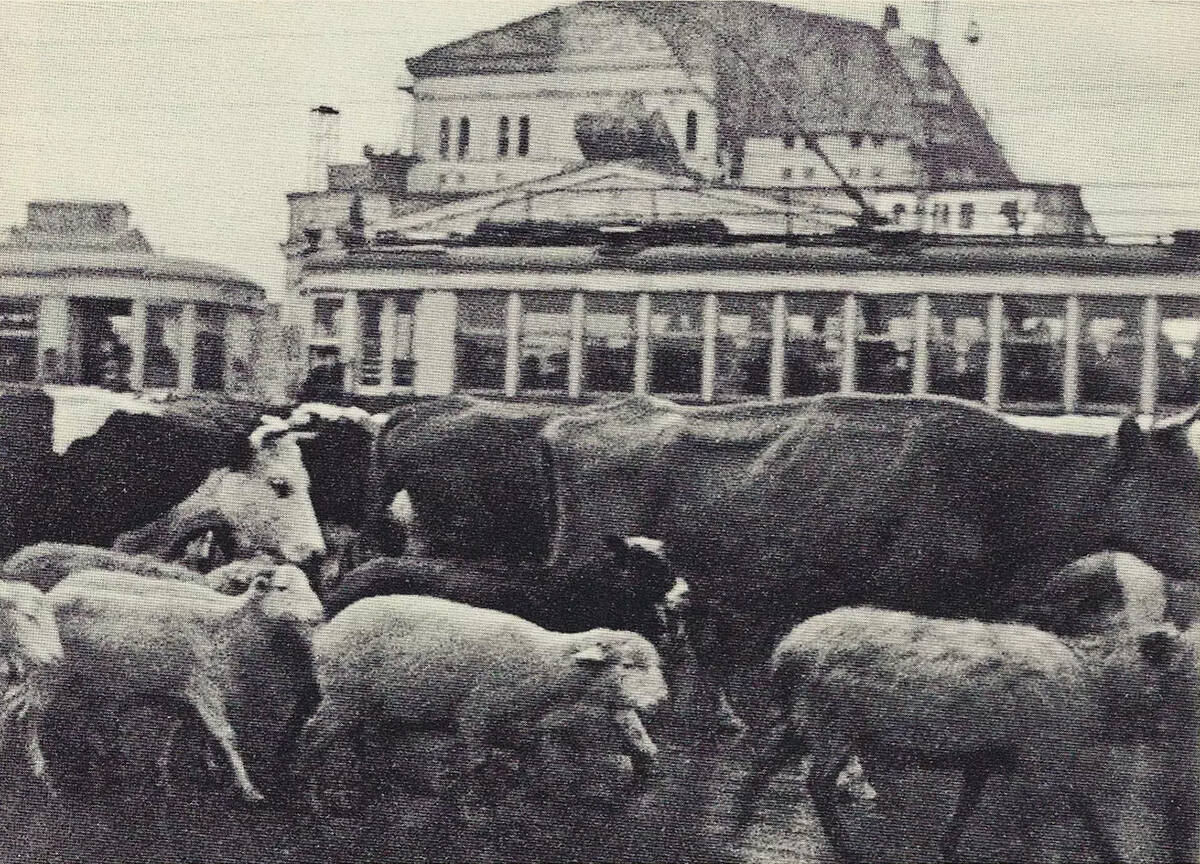 1820–1825 годы. Большой Императорский театр. Гравюра: Auguste Cadolle • 1902–1905 годы. Торговля на Театральной площади • 1941 год. Перегон эвакуируемых животных по площади Свердлова, перед замаскированным Большим театром