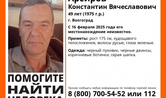 Волгоградец не выходил на связь с родными с 16 февраля. В Волгоградской области проходят поиски пропавшего 16 февраля 49-летнего Константина Вячеславовича Арсирова. С этого дня мужчина перестал выходить на связь с родными, о его местонахождении ничего неизвестно. Согласно указанным ПСО «ЛизаАлерт» приметам, рост пропавшего составляет 175 см, у него худощавое телосложение, зеленые глаза и русые волосы. В день исчезновения он был одет в черный пуховик, черные джинсы, коричневые ботинки и серую шапку. Всех, кто знает что-либо о местонахождении Константина Арсирова, просят сообщить о нем по телефону 8-800-700-54-52 или 112.