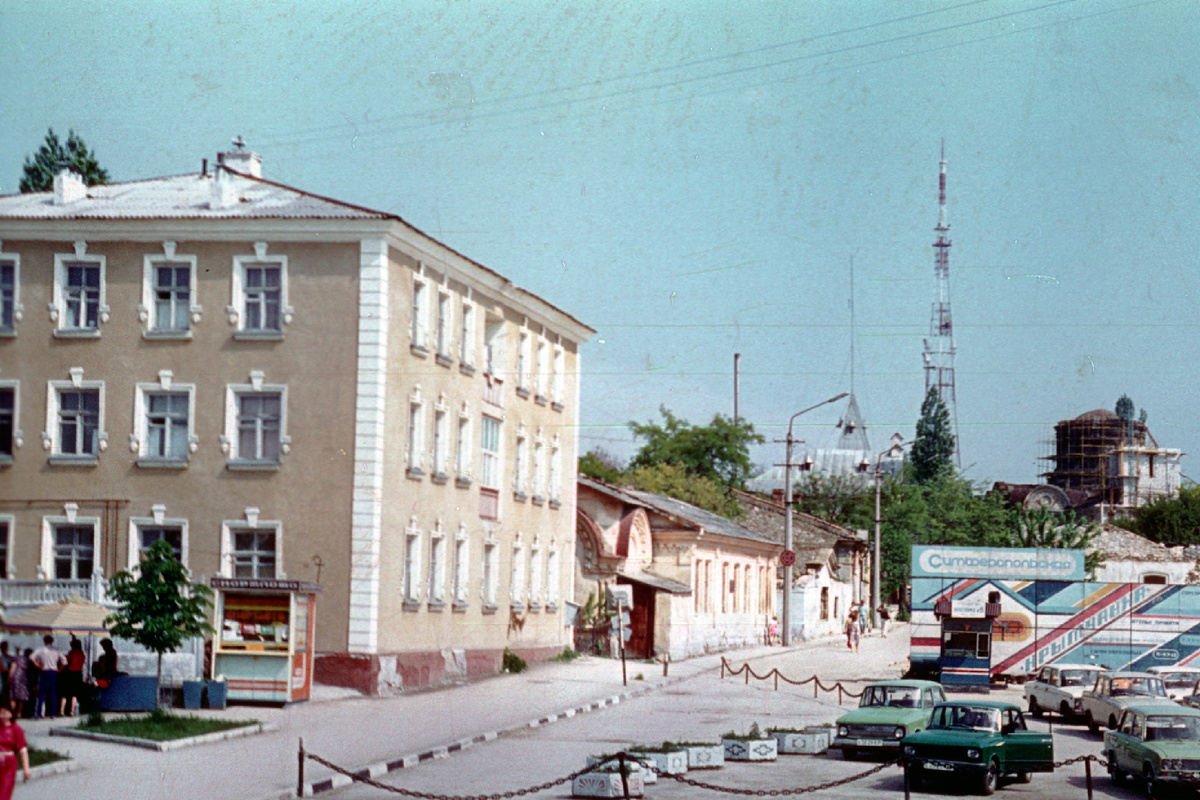 В этой публикации я покажу фотографии Симферополя, сделанные во второй половине восьмидесятых годов. Это любительские фотографии со слайдов, хранящихся у меня дома. Вид на начало Октябрьской улицы. Слева виден киоск «Спортлото», справа какое-то цветастое строение с надписью «Симферопольская крымчанка». За трёхэтажным зданием сталинской постройки располагается старейшая в городе церковь Константина и Елены с наполовину укороченной колокольней. За последние тридцать лет здесь изменилось практически всё: трёхэтажное здание уступило место торговому центру, церковная колокольня была восстановлена в прежнем виде, на месте старинных домишек за храмом расположился ещё один торговый центр. Улица Октябрьская изначально называлась Петропавловской. Своё оригинальное название она получила в честь кафедрального собора Петра и Павла, запечатлённого на этой фотографии. Столь мрачный облик храм приобрёл за десятки лет запустения, прошедшие со времени его закрытия в тридцатые годы. В советское время со