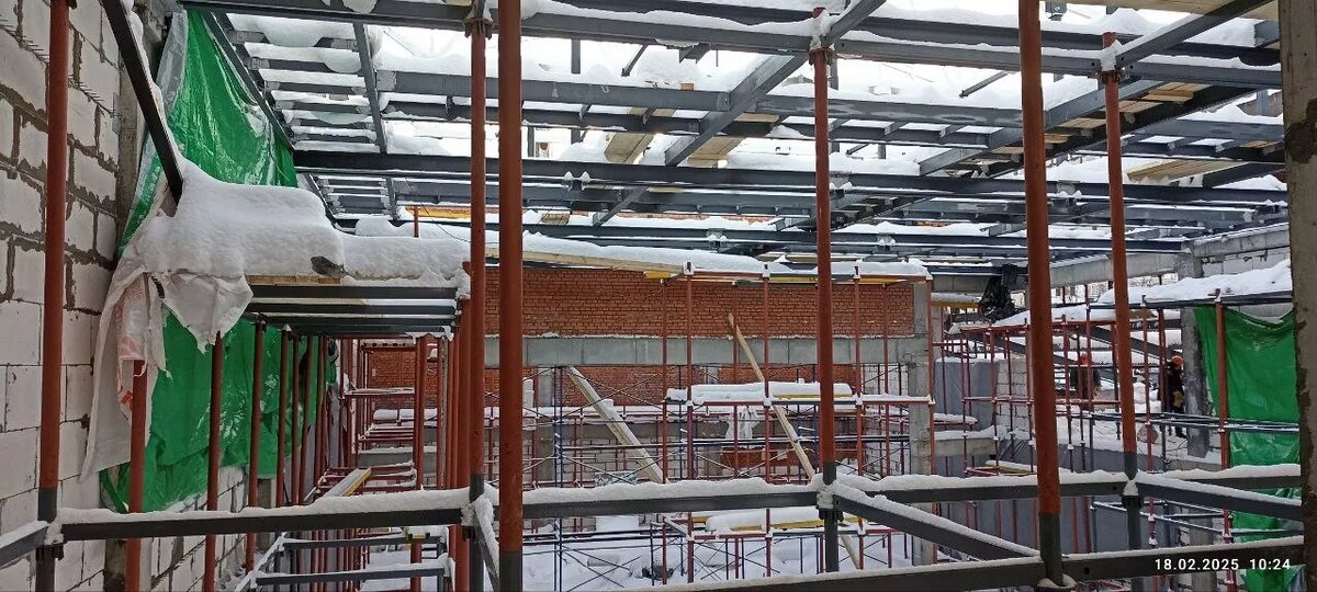 Продолжаются работы по устройству кровли и внутренних перегородок, а также утеплению фасада. В ближайшее время должен начаться монтаж фасадной системы.