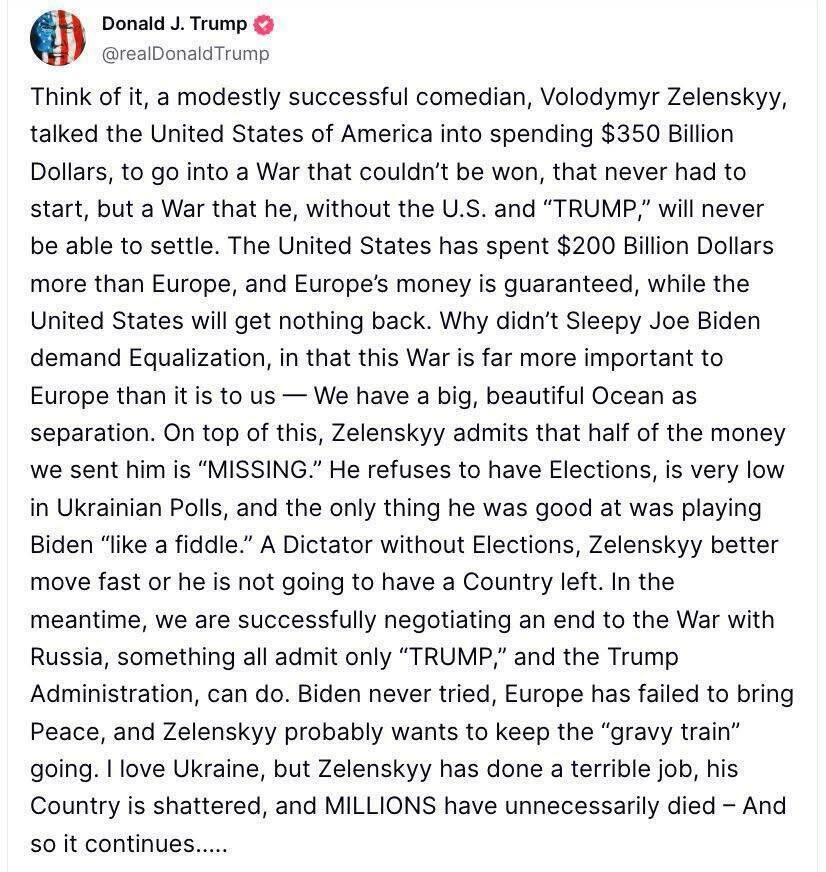 В своем посте в соцсети Truth Social Трамп ответил на заявление Зеленского о том, что он находится в «пузыре дезинформации», утверждая, что Зеленский уговорил США потратить $350 миллиардов на войну, которую нельзя выиграть и которая не должна была начинаться. Трамп также отметил, что без помощи США Зеленский не сможет завершить конфликт.