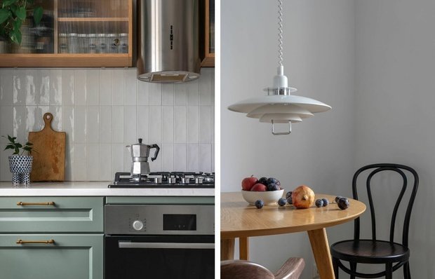 Берите на заметку интересные идеи Эта двухкомнатная квартира площадью 50 м² в московской сталинке принадлежит архитектору Вере Конаковой. Интерьер создавался как максимально спокойное пространство, которое стало фоном для дорогих сердцу вещей и винтажных находок. Ключевыми пожеланиями хозяйки были светлая палитра, натуральные материалы и комфортная организация хранения. Кухня заслуживает отдельного внимания: здесь красота встречается с функциональностью и продуманными решениями. В процессе работы над проектом объединили санузел, демонтировали дверь в кухню и увеличили объем хранения в прихожей, заменив часть стен встроенными шкафами. Кухня выполнена на заказ и оформлена лаконично: основной объем хранения размещен в нижних шкафах, а навесные секции появились в упрощенном виде уже в ходе эксплуатации. Рабочую поверхность покрывает натуральный мрамор — его удалось купить по выгодной цене на распродаже слэбов. Стены выкрашены матовой краской и дополнены плиткой Equipe в зоне фартука. Напол