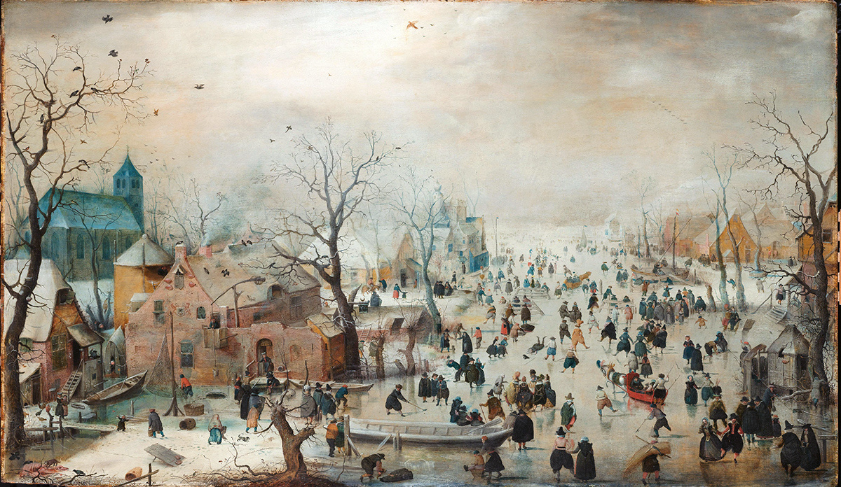 Замерзшая река, усеянная людьми, играющими или работающими, — вот сюжет этого зимнего пейзажа, написанного Хендриком Аверкампом (1585-1634). Стоит рассмотреть его до мельчайших деталей: от поскальзывающегося человека до чьего-то голого зада. С помощью специального копья, этот человек наловил себе кучу вкусных угрей через отверстие во льду. Это похоже на граффити, но на самом деле это подпись художника. Хендрик Аверкамп подписал свою работу «Haenricus Av.» и добавил рядом с ней маленькую фигурку. Аверкамп включил в свой пейзаж все виды традиционных зимних занятий. Здесь это срезание тростника, представленное человеком, несущим на спине связку тростника, к которой привязана его коса. Эти конные сани, управляемые кучером, являются роскошным транспортным средством на льду. Кто-то провалился под лед рядом с застрявшей в льду лодкой. Прохожие спешат помочь бедняге. Такое судно могло развивать значительную скорость. Мужчина поскальзывается и падает, теряя палку и шляпу. Этот человек играет в