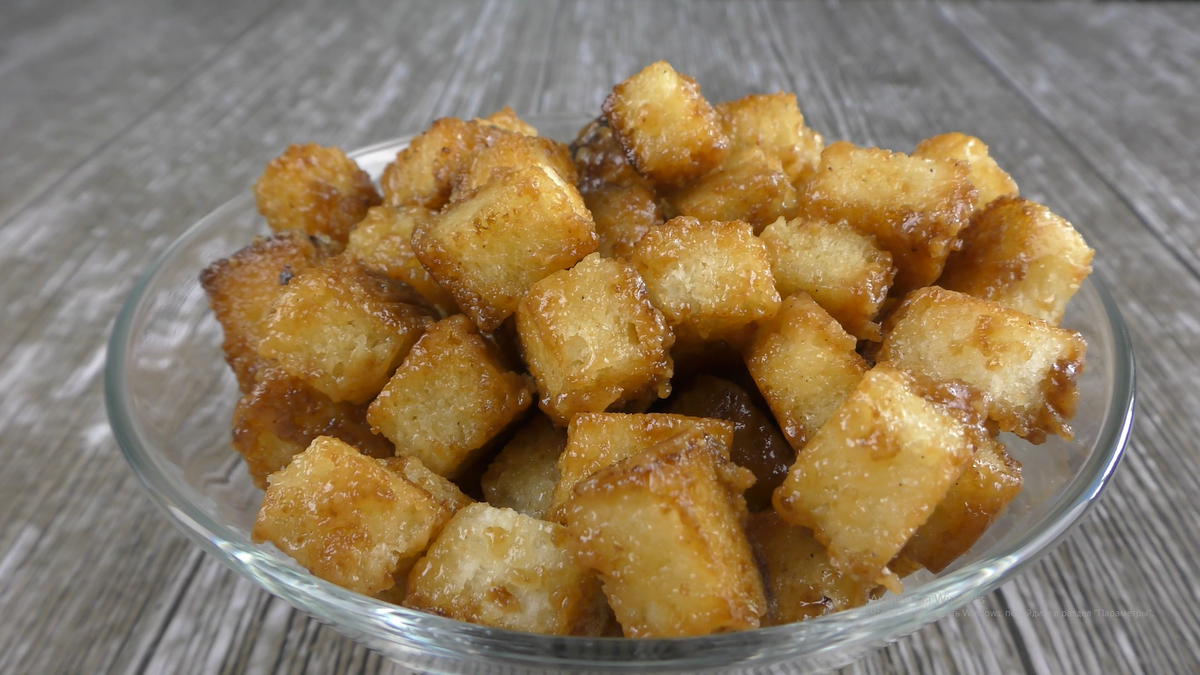 Хлеб нарезаем небольшими кубиками (примерно 1,5×1,5 см). Обжариваем на сухой сковороде на слабом огне до хрустящей золотистой корочки. ✅ 2. Делаем карамель