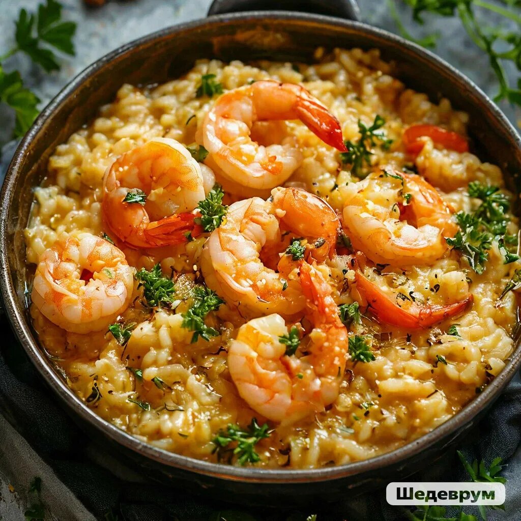 Ризотто с креветками в сливочном соусе.