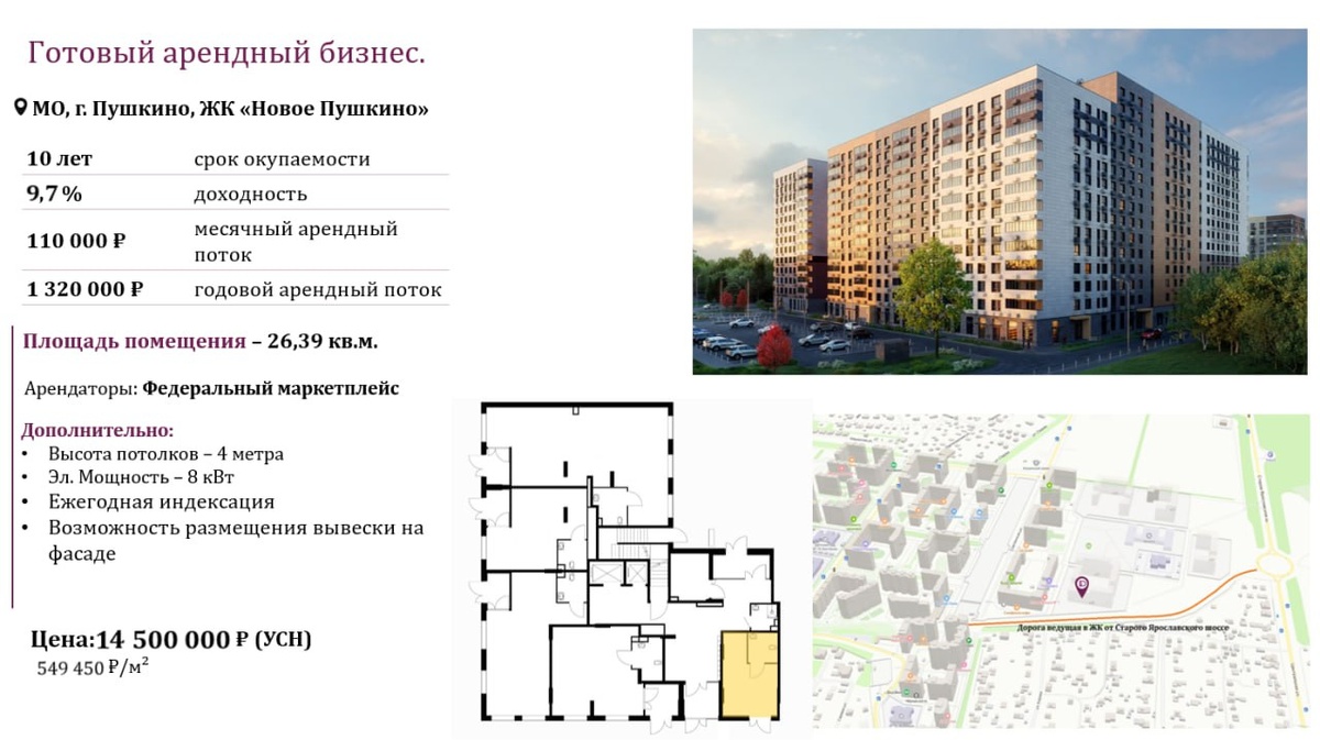 Предлагаем вашему вниманию уникальное предложение – приобретение готового арендного бизнеса площадью 26.39 кв.м. в популярном жилом комплексе "Новое Пушкино". Долгосрочный договор аренды подписан с федеральным маркетплейсом, что гарантирует стабильный доход на протяжении ближайших пяти лет. 📍Московская область, г. Пушкино, ЖК «Новое Пушкино» Площадь: 26,39 кв. м., Арендатор: федеральная сеть маркетплейсов. МАП: 110 000 ₽ с индексацией в одностороннем порядке 1 раз в год на индекс инфляции. ГАП: 1 320 000 ₽ Окупаемость: 10 лет Доходность: 9,7% Цена: 14 500 000 р. (УСН) 511 557 р/м _________________ Если вы хотите приобрести нежилое помещение с готовым арендным бизнесом и провести сделку с гарантией юридической чистоты свяжитесь с нашими экспертами по телефону 8 (495) 033 55 55 или оставьте заявку на бесплатную консультацию на сайте https://www.investfirst.ru Мы с удовольствием ответим на все ваши вопросы! #недвижимость #investfirst_габ #габ