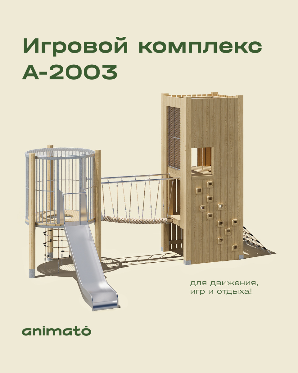 Игровой комплекс А-2003 — универсальное пространство для детей от 6 до 12 лет. Он сочетает элементы для активных игр и физического развития: верёвочные конструкции, горка и скалодром. Здесь школьники смогут не только выплеснуть энергию, но и развить ловкость и воображение, придумывая новые игры. А внутри деревянной конструкции можно скрыться от солнца и передохнуть.