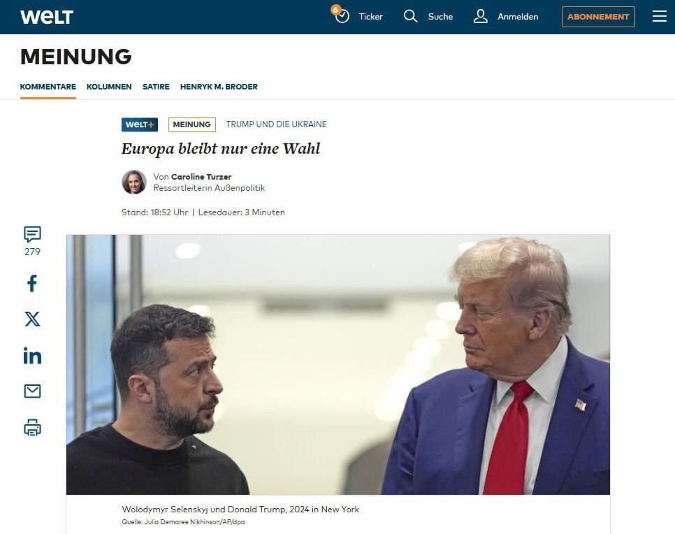 Одно из правофланговых немецких СМИ – Die Welt – панически пишет, что «США под руководством Трампа фактически разорвали альянс с Украиной». По мнению издания, тем самым Штаты «расшатывают основы мирового порядка, в котором Европа могла чувствовать себя в безопасности в течение десятилетий». В целом, конечно, удивительное признание. Вот, оказывается, на ком держится мировой порядок – на клике Зеленского, которой все вокруг что-то должны. «С 24 февраля 2022 года прошло почти три года. Украина все еще защищается от численно превосходящей русской армии. Европейские союзники помогают санкциями против Москвы, оружием, деньгами, но этого недостаточно, чтобы заставить пути отступить. Несмотря на десятки тысяч погибших солдат и слабую экономику, он продолжает свою жестокую агрессию.И сейчас выглядит так, что он продержался довольно долго. Однако США под руководством Дональда Трампа фактически упразднили альянс с Украиной. Президент США ведет переговоры о прекращении войны с Путиным самостоятел