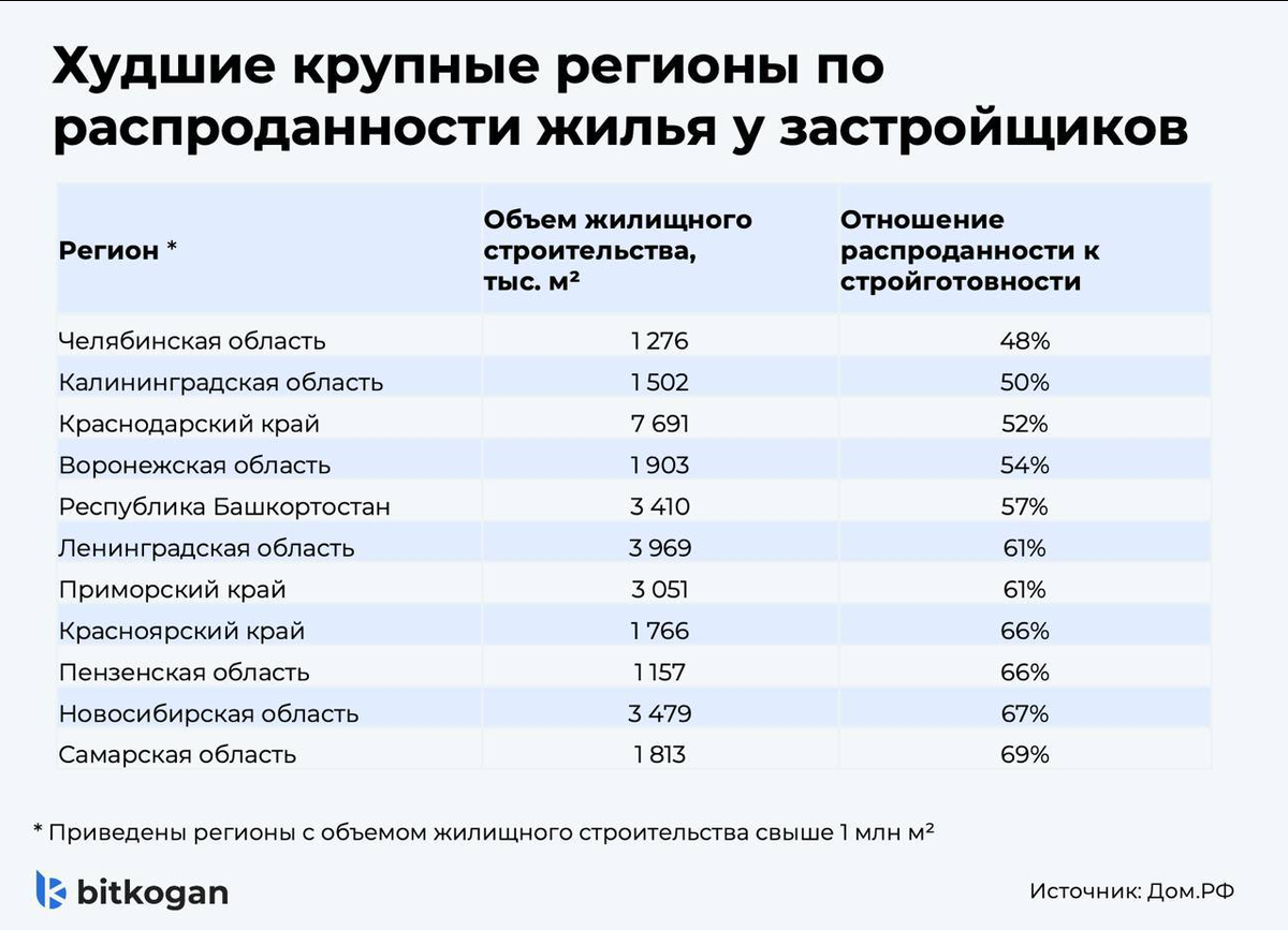 Мы недавно обсуждали, что в среднем по стране продажи жилья идут неплохо — показатель распроданности к стройготовности был 76%. По итогам января он уже 73%. Вроде всё в пределах нормы (70–80%), но тренд, мягко говоря, не радует. И дальше ситуация, скорее всего, будет ухудшаться. Еще в прошлом году мы предупреждали, что главный удар от высоких процентных ставок придётся на второй квартал 2025 года. Для застройщиков, которые продают жилье в основном за счет ипотечных сделок, это означает серьёзные проблемы. Проблема не в среднем показателе РФ, а в конкретных регионах. Если смотреть по стране в целом, всё выглядит терпимо. Но средняя температура по больнице — вещь обманчивая. Если смотреть по регионам, то там уже начались банкротства отдельных компаний. В таблице показаны регионы, где продажи у застройщиков идут плохо, — чтобы было понятно, где риски выше. Что будет с крупными застройщиками? 🔎Крупные публичные компании обладают запасом прочности, чтобы пережить сложные времена. Но 2025 г