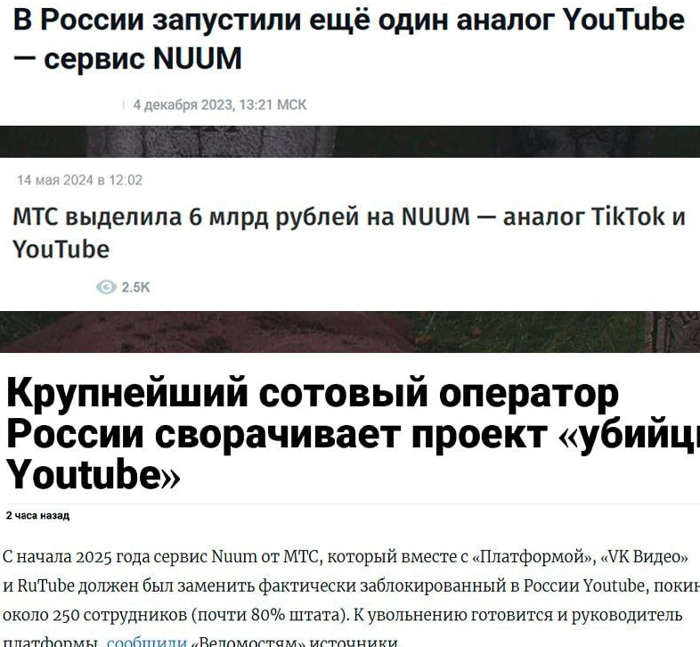 И ничего удивительного тут нет. Сколько мы уже повидали этих убийц и Ютуба и Википедии и всех популярных мессенджеров. Только толку от них никакого нет, потому что занимаются они не созданием так называемых убийц, а тупо копируют практически под ноль. Естественно, что копия никогда не будет лучше оригинала и не заинтересует зрителей. Ну это создатели убийц не останавливает. Кстати, про этот видеохостинг от МТС я практически и не слышал никогда. Может попадаться где-то информация, но я почему-то пропустил ее мимо ушей. Видимо не так долго проживёт и платформа от Симоньян и компании. Я сейчас туда зашёл (не был там сначала осени) так вот там ничего не изменилось. Как было даже у самых популярных блогеров меньше 1.000 просмотров, так, собственно говоря, и есть. Из чего можно сделать вывод, что Платформа не развивается. Что-то мне подсказывает что и цели развивать эти площадки не было. Деньги на них попилили и теперь закрывать можно. Ну а дальше можно придумать очередного убийцу какой-ниб
