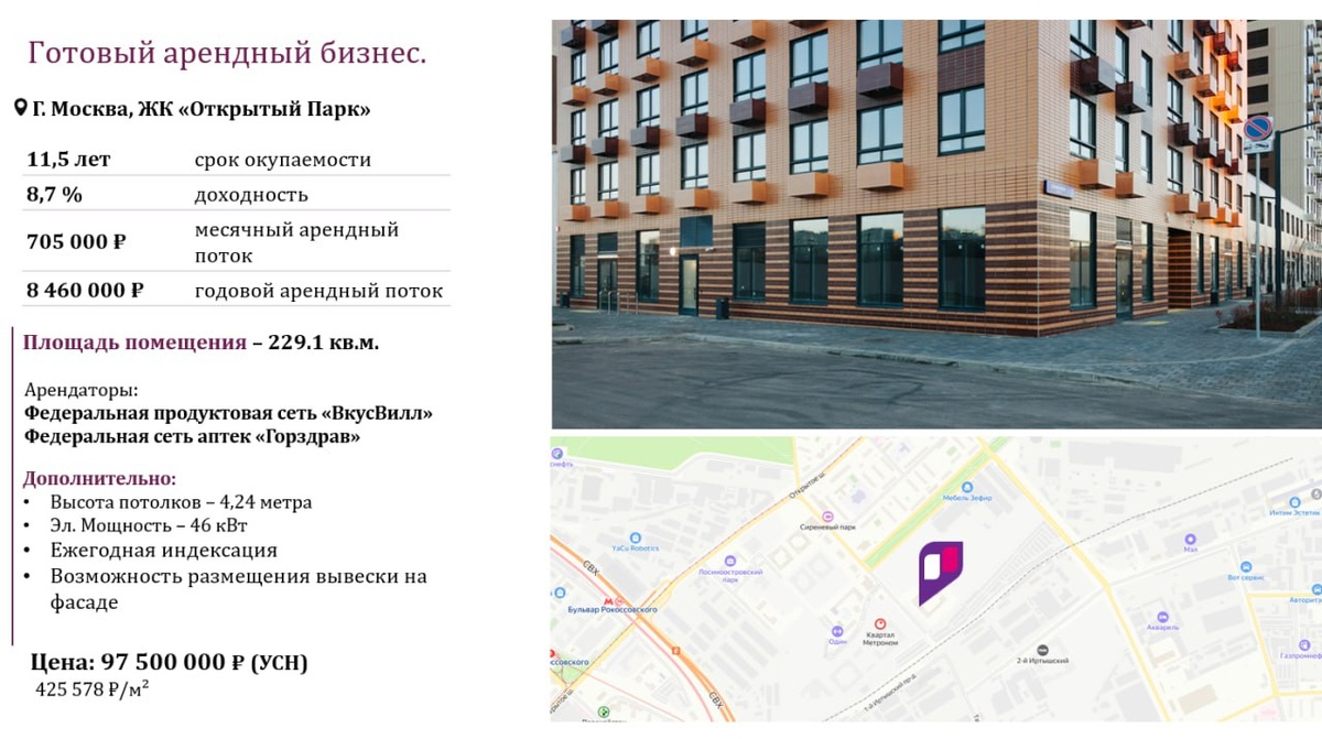 📍г. Москва, ЖК «Открытый Парк» Представляем вашему вниманию возможность приобрести готовый арендный бизнес: нежилое помещение с арендаторами площадью 229,1 кв.м. в новом жилом комплексе "Открытый парк" от ГК "ПИК". Площадь: 229,1 кв. м., Арендатор: федеральная продуктовая сети и сеть аптек. МАП: 705 000 ₽ с индексацией в одностороннем порядке 1 раз в год на индекс инфляции. ГАП: 8 460 000 ₽ Окупаемость: 11,5 лет Доходность: 8,7% Цена: 97 500 000 р. (УСН) 425 578 р/м _________________ Если вы хотите приобрести нежилое помещение с готовым арендным бизнесом и провести сделку с гарантией юридической чистоты свяжитесь с нашими экспертами по телефону 8 (495) 033 55 55 или оставьте заявку на бесплатную консультацию на сайте https://investfirst.ru Мы с удовольствием ответим на все ваши вопросы! #недвижимость #investfirst_габ #габ