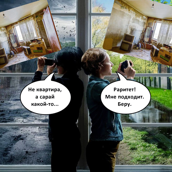 Квартира на последнем этаже — зато светлая и с красивым видом на город. А жильё на первом этаже — самое то для пожилых людей. Квартира пустая, с голыми стенами — значит, всё готово к ремонту. Ветхий барак — ничего, можно перекантоваться, а там, глядишь, дом под реновацию попадёт. Вот такой инь и ян, понимаете. Могу продолжать бесконечно.