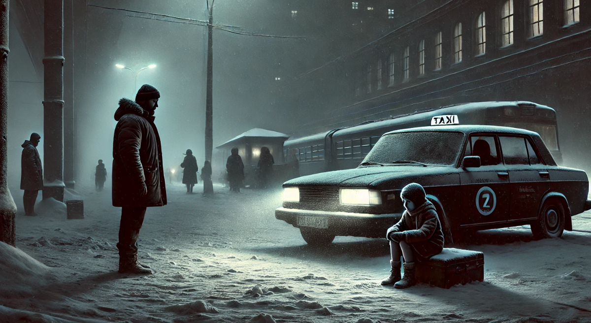 Подъехав к вокзалу, он поставил машину у обочины, выключил фары и посмотрел на площадь перед собой. Обычно здесь толпились пассажиры: кто-то ждал поезд, кто-то торопился в город, суетился, собирал чемоданы, прощался с родными. А сейчас площадь была почти безлюдной. Только снег медленно падал с тёмного неба, лениво кружась в свете фонарей.