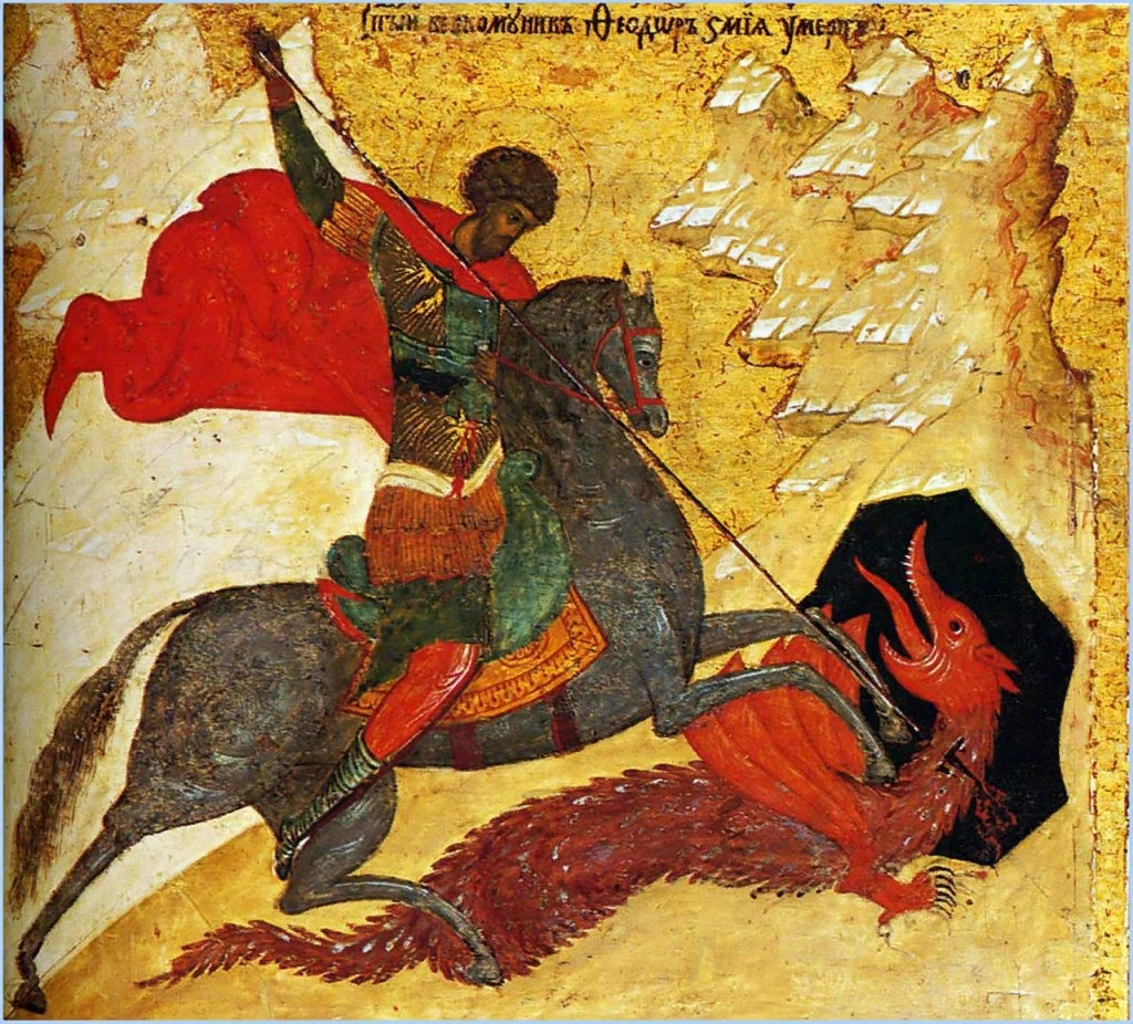 В память великомученика Феодора Стратилата, память которого празднуется церковью 21 февраля строились храмы во всех православных странах. По молитвам к нему от его икон совершались многие чудеса. Несмотря на свою силу, воинское величие, заслуги и доблести житие его мало говорит о воинских подвигах, но много о его стоянии в вере. Усердно помолившись, укрепляемый свыше он избавил город от змея. Великомученика Георгия Победоносца тоже когда чудесным образом умертвил чудовище считают отцом Феодора, иногда же именуют братом. Храбрость его была настолько велика, что молодого воина очень скоро стал военачальником Гераклеи. В то время возобновились гонения на христиан. Первыми были севастийскеи мученики, а потом и он за отказ поклоняться «отеческим богам».