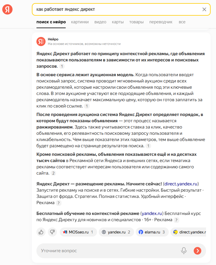 В 2024-м Яндекс внедрил в поиск инструмент Нейро. Он работает на основе нейросетей и на запрос формирует краткий ответ со ссылками на источники.