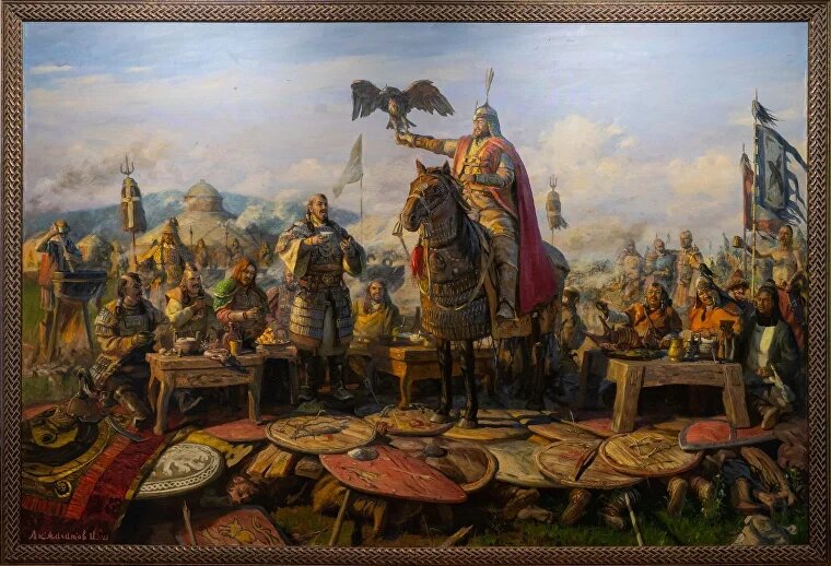 Наверняка вы хотя бы краем глаза следили за этим странным сюжетом, разворачивавшимся в последнее время. Сюжетом про муфтия Дамира Мухетдинова, которому почему-то принципиально важно было держать у себя в рабочем кабинете перед глазами скандальную картину. На картине этой изображено одно из самых болезненных событий за всю древнерусскую историю. Полотно имеет длинное название: "Пир монгольских военачальников Чингисхана во главе с Джэбэ и Субэдэем после победы над объединенным русско-половецким воинством на Калке 31 мая 1223 года". Написано оно было в 2023 году Ильдаром Акжигитовым, членом Союза художников России. Если кому-то интересно и важно ее увидеть, то вот она: Субудай и Джэбэ в центре, они ликуют, празднуют свою победу. Один из них на коне. рядом столы с едой за которыми сидят веселые монголы. А размещены эти все столы, монголы и конь на множестве щитов. Под щитами страшной смертью умирают русские воины и князья, попавшие в монгольский плен. Напомним, что домой после этой битвы