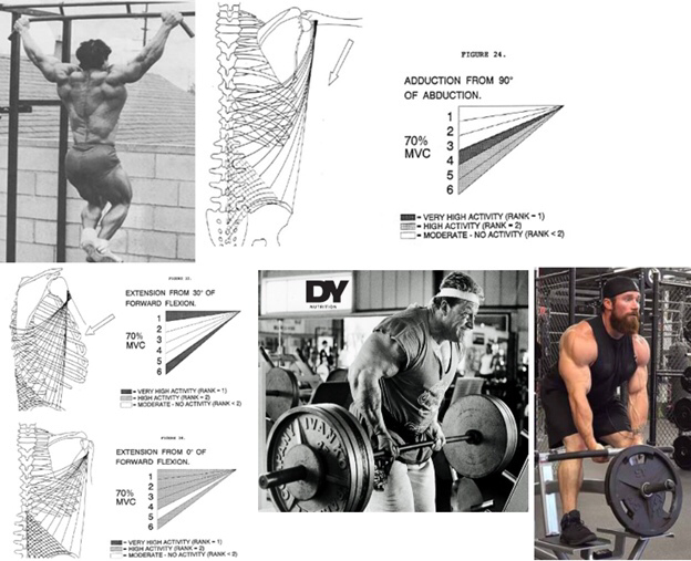 Приведение от 90 °приведения. Во время отведения от 90 ° отведения (см. Рисунки 24 и 25), только сайты 4-6 дали очень высокий очень высокий взносы на 70% MVC. Этот сценарий был предсказан, так как нижние волокна имеют большой вращательный момент, в то время как верхние волокна в основном сжимают сустав с конечностью в этой позиции. Упражнения с акцентом в латеральные волокна широчайшей мышцы спины (ширина спины): -Все вертикальные тяги к груди и за голову широким хватом, тяга Ятса, тяга Т-грифа. Разгибание от 90 °, 30 ° и 0 ° переднего сгибания. Когда Latissimus Dorsi выполняет движение во всех трех позициях разгибания (полная амплитуда) из предварительно согнутого до угла 90 гр. плеча, высокие уровни вклада наблюдаются во всех участках мышцы. Упражнения для проработки всего массива широчайших мышц спины: Если стоит задача проработать весь массив широчайших одним единственным упражнением, то любое упражнения из заданной позиции: горизонтальные тяги, узким и средним хватом; тяги вер