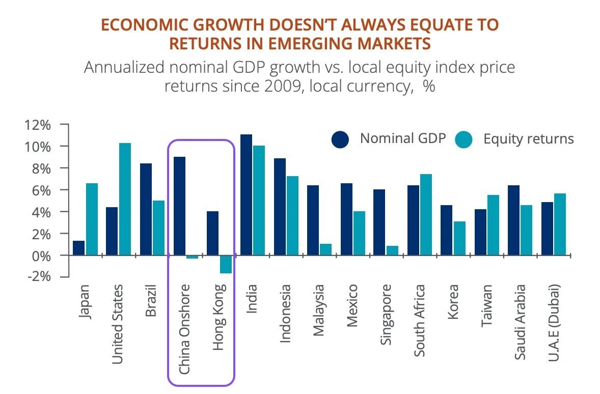 Аналитики транснационального финансового конгломерата J.P.Morgan в своем годовом отчете отмечают одну редкую закономерность, которую они озаглавили как: “OPPORTUNITIES IN EMERGING MARKETS” (возможности на развивающихся рынках) Они заметили, что среднегодовой номинальный рост ВВП с 2009 по 2024г. по Китаю составляет 9.1%, при этом доходность Китайского фондового рынка за этот же период является отрицательной. Такой выраженной аномалии в росте ВВП и одновременным падением акций компаний не наблюдается ни в одном другом регионе, кроме Гонконга и материкового Китая (иллюстрация). В течение следующих лет они ожидают "закрытие" этой аномалии через рост Китайского фондового рынка. Вместе с этим, они также предупреждают: "Инвесторам необходимо быть внимательными к динамике акций Азиатского блока, а также быть весьма избирательными в определении того, куда и в какой пропорции инвестировать во всем спектре китайских и азиатских компаний." В Мидекс Капитал мы также неоднократно выражали наши пози