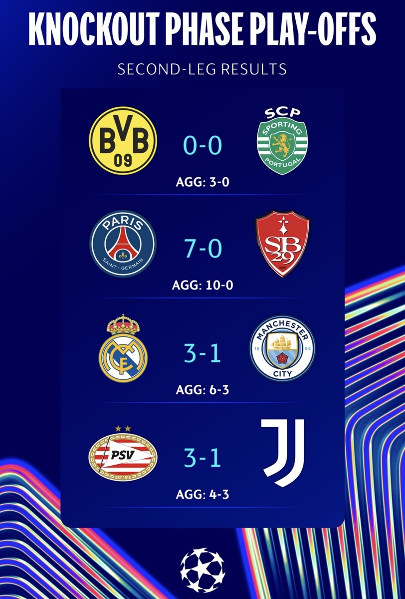 Дортмундская "Боруссия" благодаря преимуществу добытому в первой встрече провела матч под свою диктовку и спокойно довела встречу до необходимого результата. Стоит отметить, что у "Спортинга" отсутствовал целый ряд лидеров, включая главного бомбардира команды Дьокереша. Серу Гирасси был близок к тому, чтобы отличиться в 10 встрече к ряду в еврокубке, но пенальти не реализовал. Вратарь "Спортинга" Руи Силва – лучший игрок матча. "ПСЖ" не пощадил соседа по внутреннему чемпионату и закинул сразу семь голов. Сказка "Бреста" заканчивается в этом еврокубковом сезоне. Россиянин Матвей Сафонов остался на скамейке запасных. Полузащитник "ПСЖ" Витинья – лучший игрок матча, 1 гол. Мадридский "Реал" в великолепном стиле разбирается с "Манчестер Сити" снова забивая трижды в ворота команды Гвардиолы. Кризисный Сити впервые пробил в створ ворот только на 75 минуте матча. Мбаппе оформил первый хет-трик за "Реал" в Лиге чемпионов. Нападающий "Реала" Килиан Мбаппе – лучший игрок матча, 3 гола. Первое