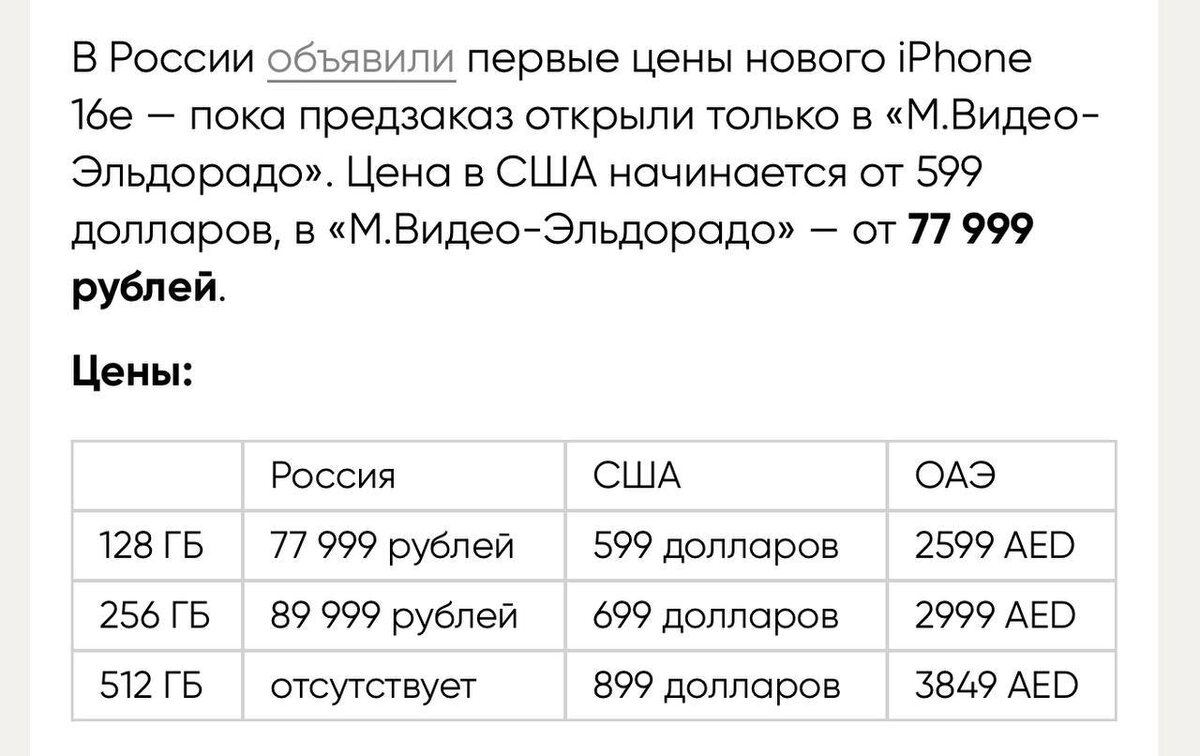 Интересно, что в США стартовая цена нового iPhone 16e будет составлять от 599 до 899 долларов в зависимости от конфигурации устройства. В отличие от российского рынка, где цены традиционно оказываются выше, американские пользователи смогут приобрести гаджет по более привлекательной стоимости, что связано с разницей в налогообложении и других экономических факторах.