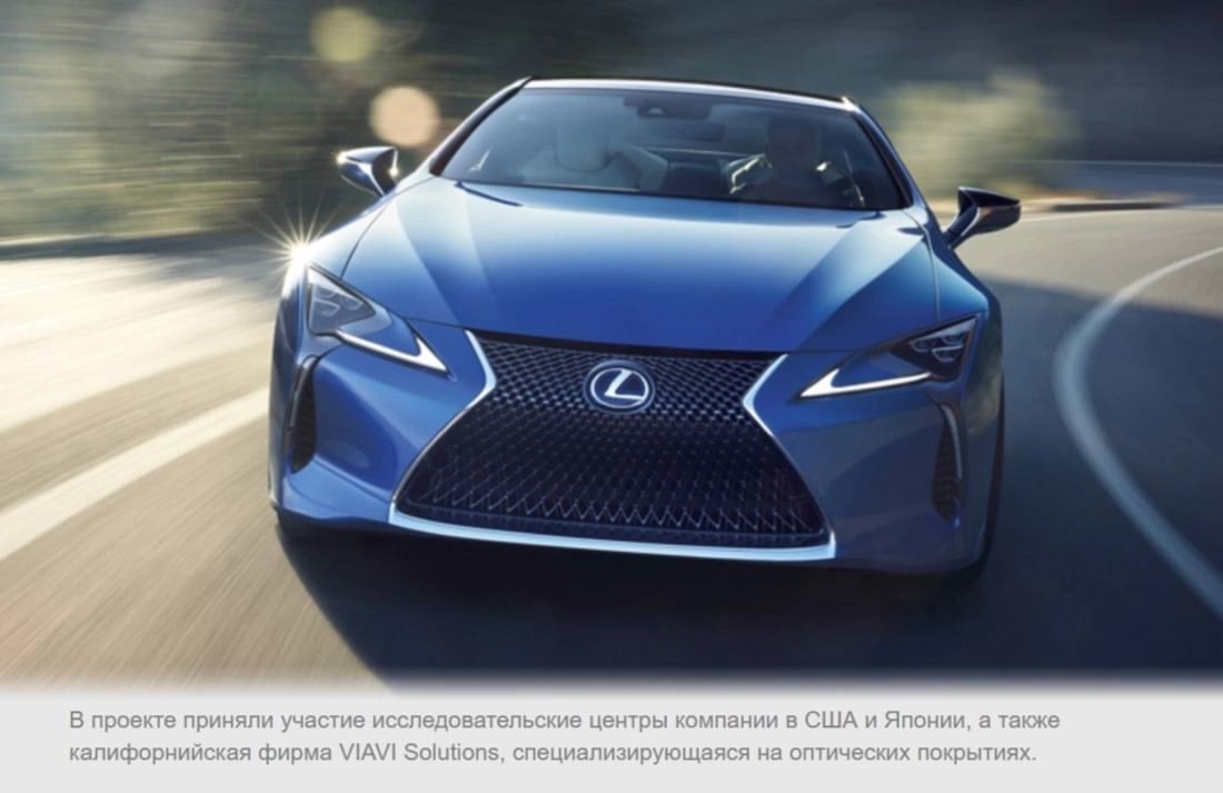 Крылья бабочек из рода Морфо славятся глубоким и переливчатым синим оттенком. Удивительно, но никакого природного синего пигмента на них нет, а за окраску отвечают триллионы микроскопических структур на поверхности чешуек. Тот же принцип применили разработчики эксклюзивной краски Structural Blue, созданной для лимитированного издания купе Lexus LC Structural Blue Edition. Экспериментаторы сначала изучили крылья бабочки, а потом постарались воспроизвести их поверхность при помощи многослойного покрытия с армией микроскопических хлопьев. Первоначально нужный результат достигался только при 40 слоях пигмента, но подбором параметров краски их число удалось снизить до 7, что уже было пригодно для мелкосерийного выпуска автомобиля. Эти семь слоев уложены в промежутке толщиной 15 микрон между грунтовкой и верхним прозрачным слоем. «Изначально я опирался на достижения в области исследований фотоники, проводимых в телекоммуникационной отрасли. Они работали над широкополосными, не зависящими от