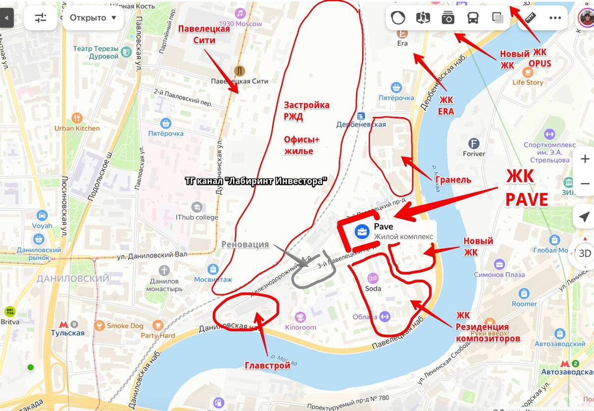 ЖК «PAVE», бизнес-класс, застройщик FORMA. Адрес: г. Москва, проезд 2-й Павелецкий, вл. 4/6. Метро «Тульская» 20 минут пешком. Выдача ключей до 02.2029. Текущие цены от: ЕВРО-2 (43 м2) — 16,7 млн руб. ЕВРО-3 (76 м2) — 27,5 млн руб. ЕВРО-4 (89 м2) — 28,9 млн руб. Знаю-знаю, вы, скорее всего, сейчас подумаете: да это же тот проект, который на хайпе брокеры «впаривали» незадачливым инвесторам, которые не понимали, что и где покупали. Ибо, несмотря на относительную близость к центру Москвы, ЖК строится в глубинной промзоне. Причём в достаточно скромной и нищей, с минимальной инфраструктурой, а до метро идти долго и неудобно по окологаражным тропам. Да-да, друзья, всё это так. Но! Не торопитесь делать преждевременные выводы. Давайте сначала к тому, что сейчас видят наши глаза, добавим еще парочку вводных. А именно — потенциал локации и планы города. Ведь в этих вводных нас ожидают парочка сюрпризов, о которых не все знают. Итак, начинаю «разбор» локации. По традиции, начну с того, что и гд