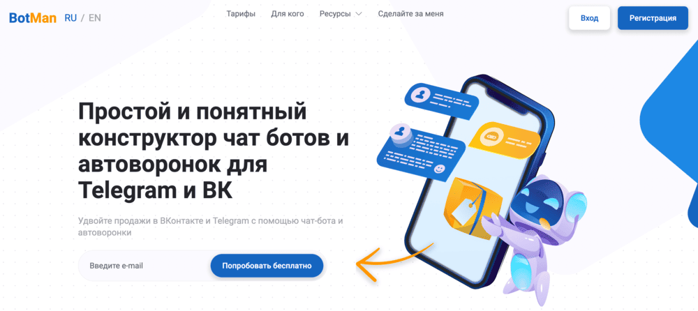 Botman - визуальный конструктор для создания чат-ботов и автоворонок в Телеграм и ВК, есть рассылка по подписчикам своей группы или канала, возможность интеграций разных инструментов, готовые шаблоны, интерфейс диалогов с аудиторией прямо в сервисе, аналитика и инструменты роста. Создать чат-бота можно за 5-10 минут и уже запустить его, для этого хватит бесплатного тарифа.