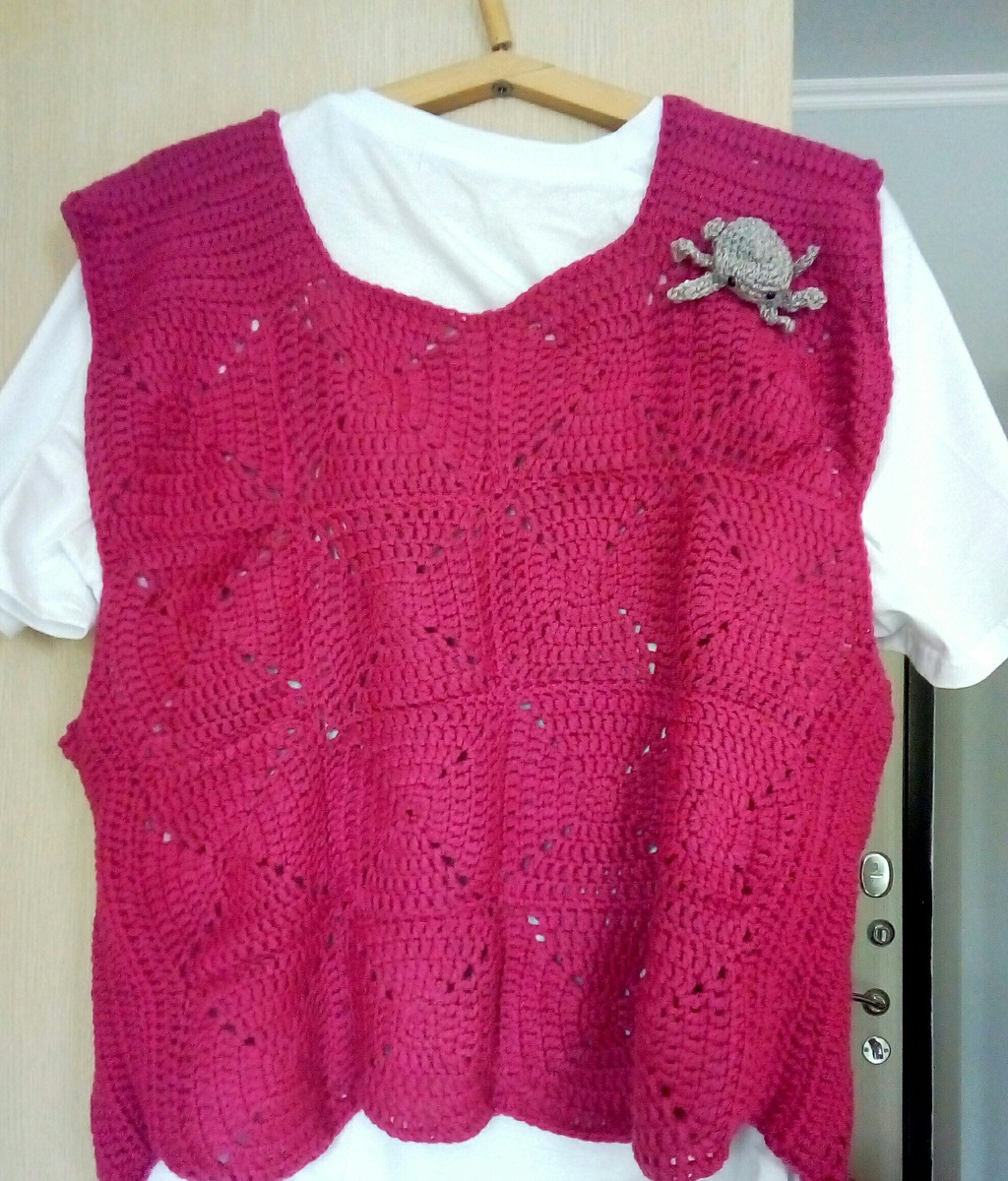 Вспомнила что вчера обещала показать своего паучка.,которого я связала вчера на одном дыхании и сразу посадила его на свой жилет "Малиновый щербет".Хотела еще вышить под ним паутину ,но подумала что будет уже перебор.). как вам?