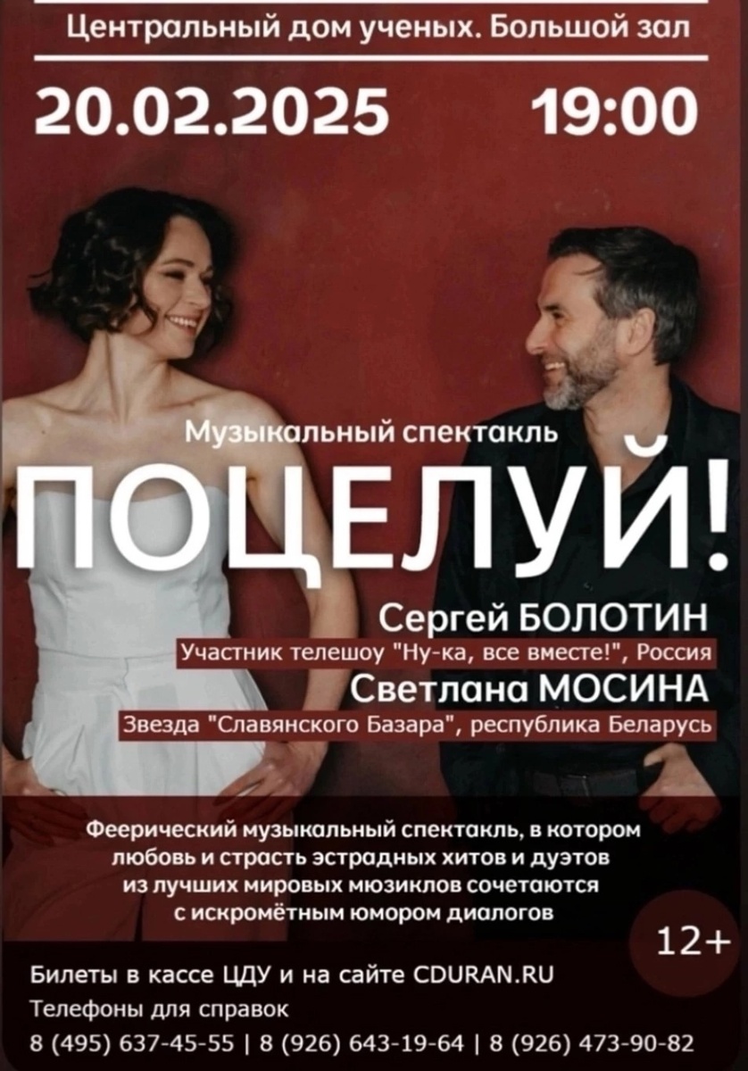 Согласитесь, что уже к середине февраля тема любви, витающая вокруг, достигает максимальных значений. Поэтому заметив на афише Продюсерского центра Виталия Злотникова название "Музыкальный спектакль "Поцелуй", я поняла, что увидеть это именно сейчас будет очень правильным выбором. И музыкальный спектакль, состоящий из самых красивых песен мировых мюзиклов, не разочаровал! На сцене всего двое: ОН и ОНА. ОН страстно признается в любви и надеется на взаимность. ОНА сомневается в чувствах и предпочитает держать дистанцию. Именно вокруг этой парадигмы и раскручивается сюжет, на который, как на невидимую нить нанизываются лучшие хиты из мировых мюзиклов о любви: «Ромео и Джульетта», «Граф Монте-Кристо», «Анна Каренина», «Бал вампиров», «Мастер и Маргарита», «Д’Артаньян и три мушкетёра», «Джейн Эйр», «Грейс» Режиссер и автор сценария Сергей Болотин выстраивает эту цепочку мастерски, заставляя героев пусть и маленькими шажками, но двигаться навстречу друг другу. Между песнями ОН и ОНА обсужда
